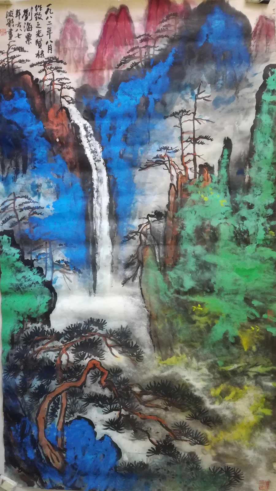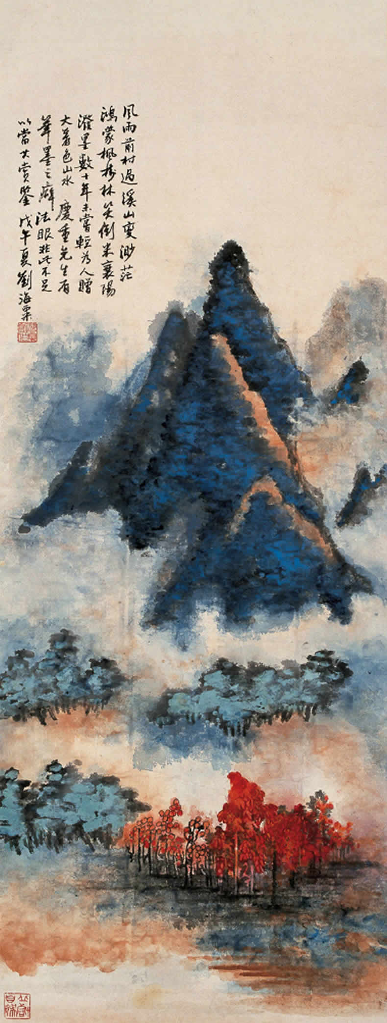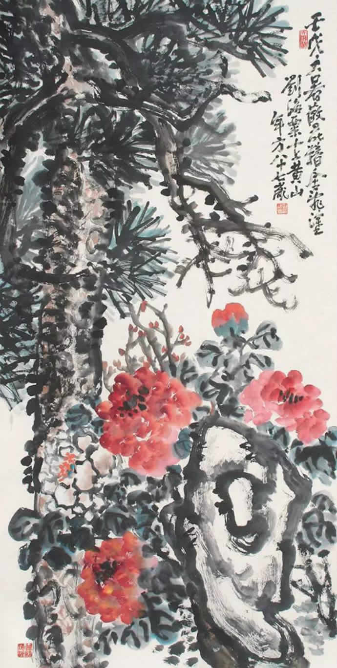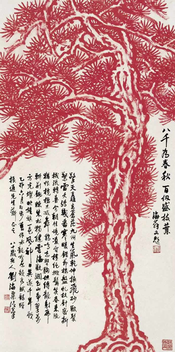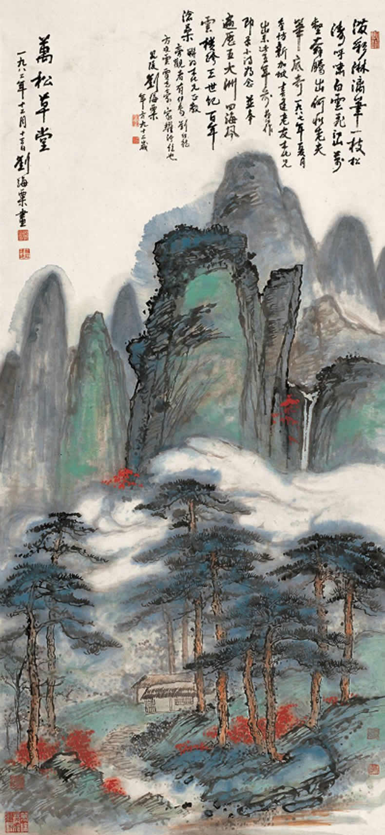 刘海粟,现代画家、美术教育家、中国流艺术家画派创始人之一。江苏常州人。1912年与乌始光、张聿光等创办上海图画美术院,后改为上海美术专科学校,任校长。1949年后任南京艺术学院院长。早年习油画,书法学康有为,苍古沉雄。兼作国画,线条有钢筋铁骨之力。后潜心于泼墨法,笔飞墨舞,气魄过人。晚年运用泼彩法,色彩绚丽,气格雄浑。历任南京艺术学院名誉院长、教授,上海美术家协会名誉主席。中国美术家协会顾问。英国剑桥国际传略中心授予“杰出成就奖”。意大利欧洲学院授予“欧洲棕榈金奖”。
