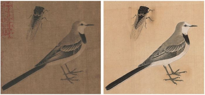 △左 五代 黄筌《写生珍禽图》(局部)丨右 于非闇摹《写生珍禽图》(局部)