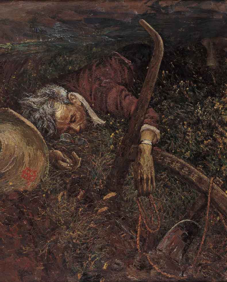 主题思想要通过人物塑造体现出来。在画里我抓住和突出了这么一些东西:一个充满智慧而忧伤的脑袋,一双勤劳而被折磨得皮包骨的双手。一具木犁和两粒硝酸甘油药片。在20世纪70年代,在社会主义的中国,一个受折磨的农机专家倒在世界上最落后的生产工具上面死去了,这是多么大的讽刺啊荒芜的土地上秋风萧瑟,晚风吹拂着农机专家银白色的头发,枯黄的野草在暮色中打颤,未被纳入画面的老黄牛正在哀鸣,它日夜相伴的老人去世了。