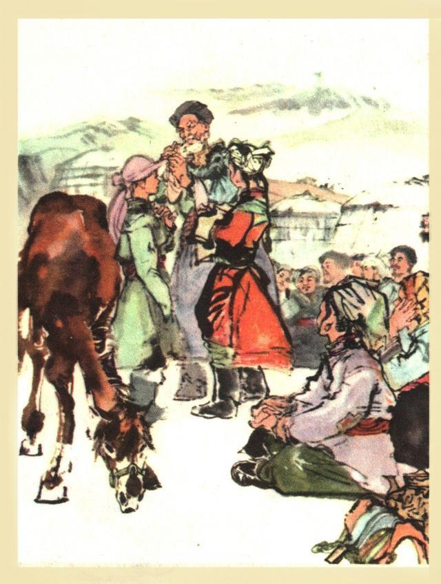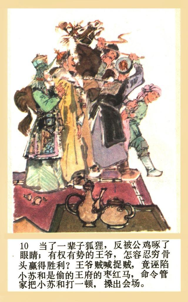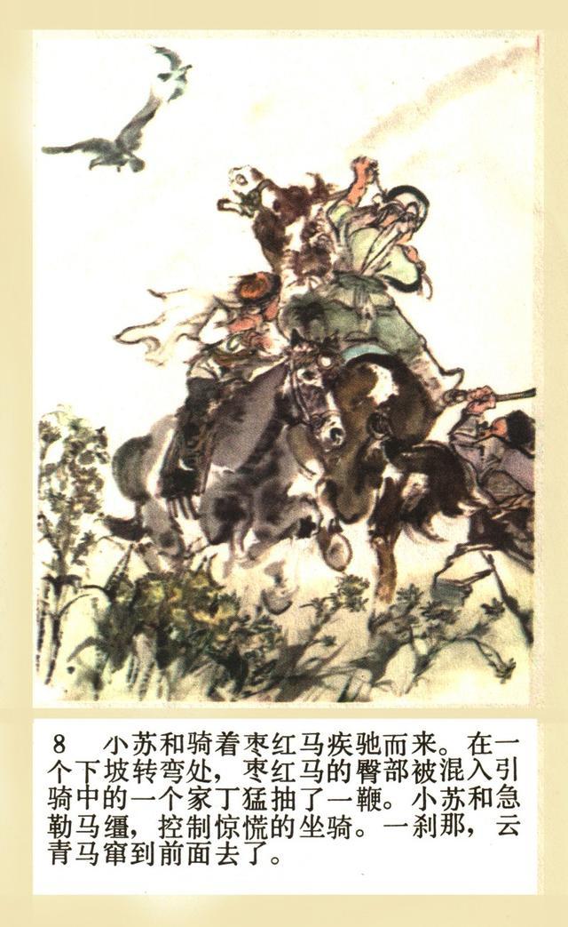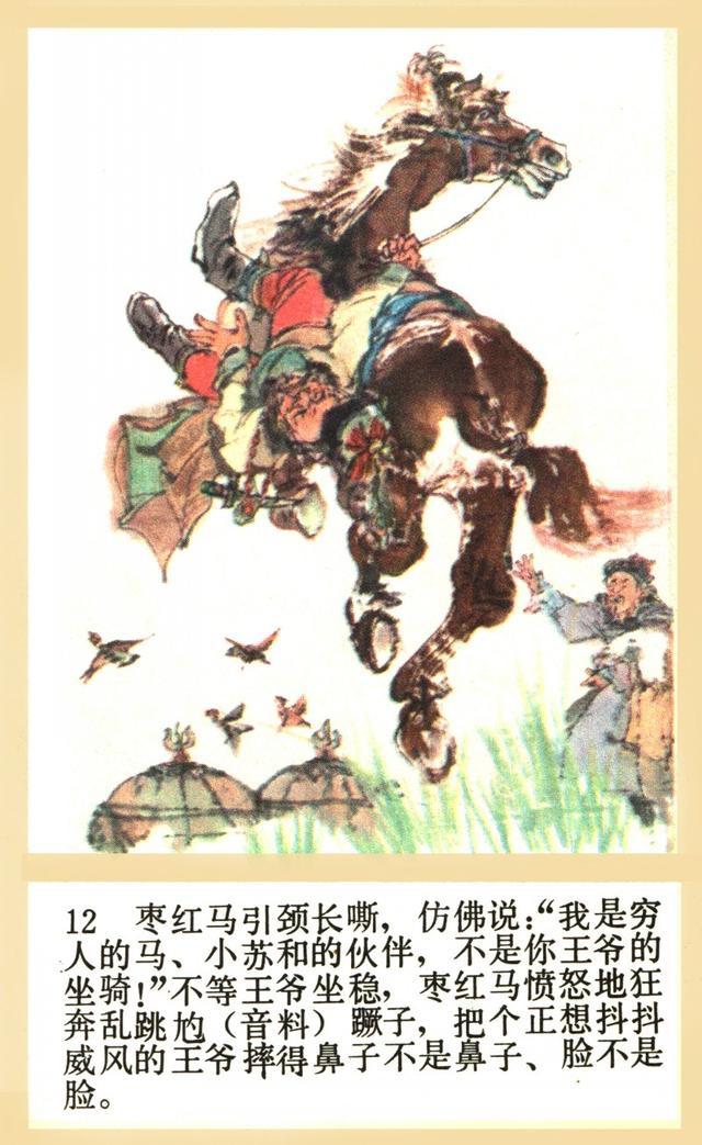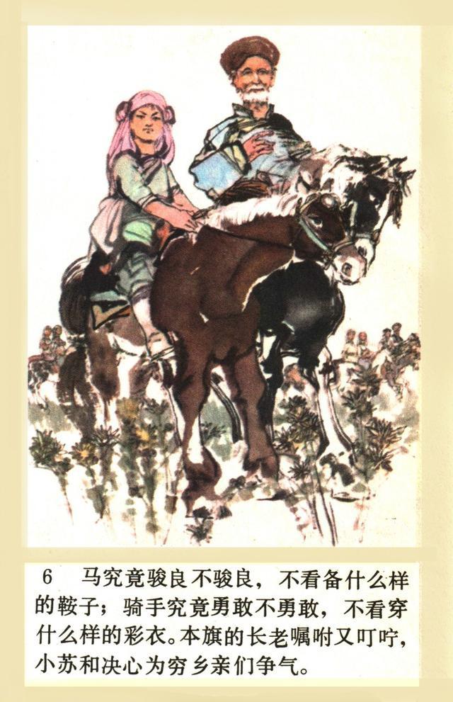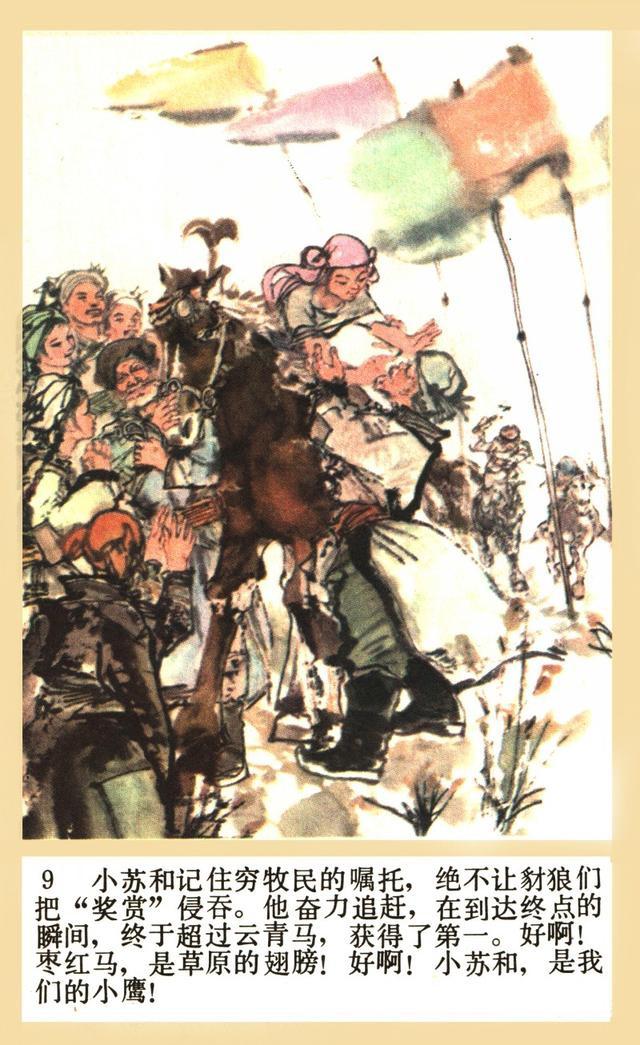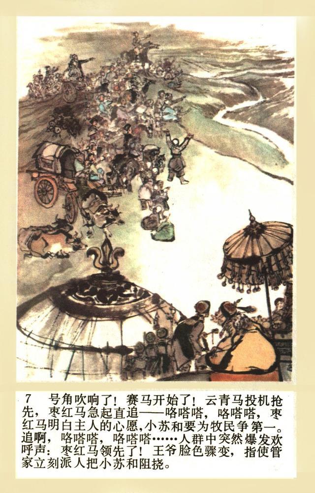 5.穷牧民们商议了又商议,要挑选出代表本旗百姓的旗手和快马,在赛场上争第一,不让王爷借口搜刮穷牧民。挑呀,选呀,一千匹马中挑上了枣红马,一千个人中选出了小苏和。小苏和两眼放光,说:『我一定要争得第一,为乡亲们夺回王爷抢去的牛羊!』