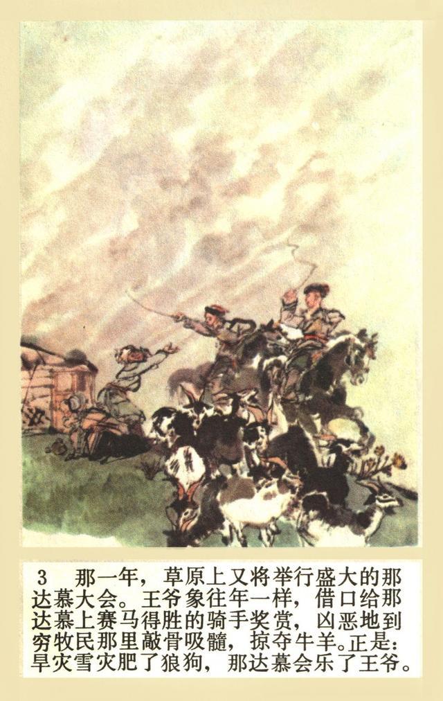 1.很久很久以前,草原是封建王爷的草原,牲畜是封建王爷的牲畜,百姓在王爷的黑蟒鞭下呻吟。孤儿小苏和所有的贫苦牧民一样,满前襟的是泪水,满胸膛的是仇恨。