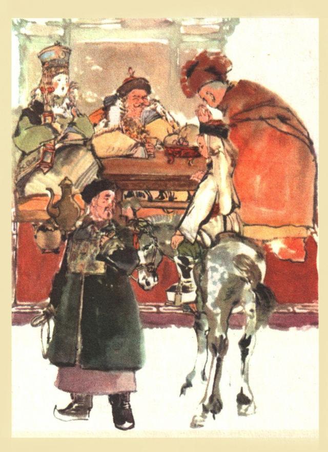 4.这时候,什么人在高台饮酒欢笑?是王爷和他那肥胖的福晋夫人!这时候,什么人最得王爷的恩宠?是云清马和他豢养的小骑手!看哪,锦缎彩衣用来打扮那个台吉(贵族)的儿子(注);嵌银的马具用来装饰他的坐骑——一匹云青色的马子。(注)指王爷豢养的小骑手。