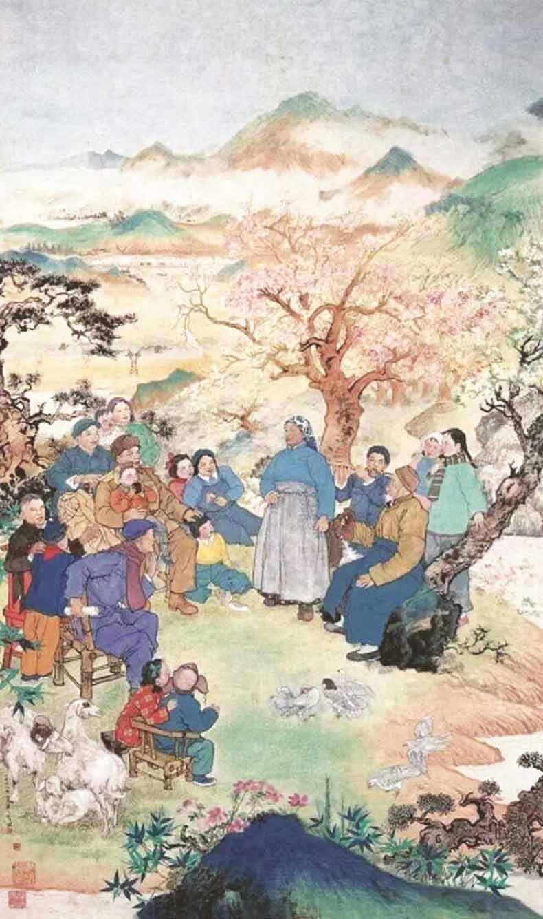 这幅《歌唱祖国的春天》是程十发在新工笔画创作领域的代表作,在1957年获得了全国第一届青年美术展览一等奖。这幅构图饱满、设色明丽的作品,展现的是一幅工农兵大家庭欢聚一堂的愉快场景,时代气息强烈。作品中既有头戴方巾、放声高歌的农村老妈妈,也有手握快板打着节拍的农村大爷,还有吹笛伴奏的少年,身着蓝布工作服的工人……完美地表现了当时工人阶级积极向上的整体面貌。画面中不乏身穿军装、怀抱嬉戏儿童的军人,亲善爱民之形象跃然纸上,一派其乐融融、和谐欢欣的景象。