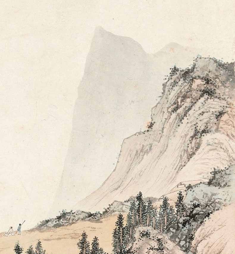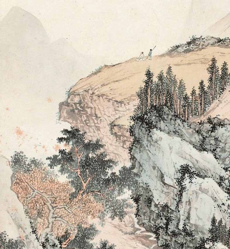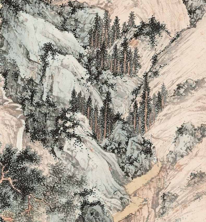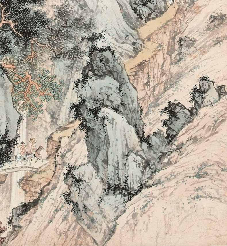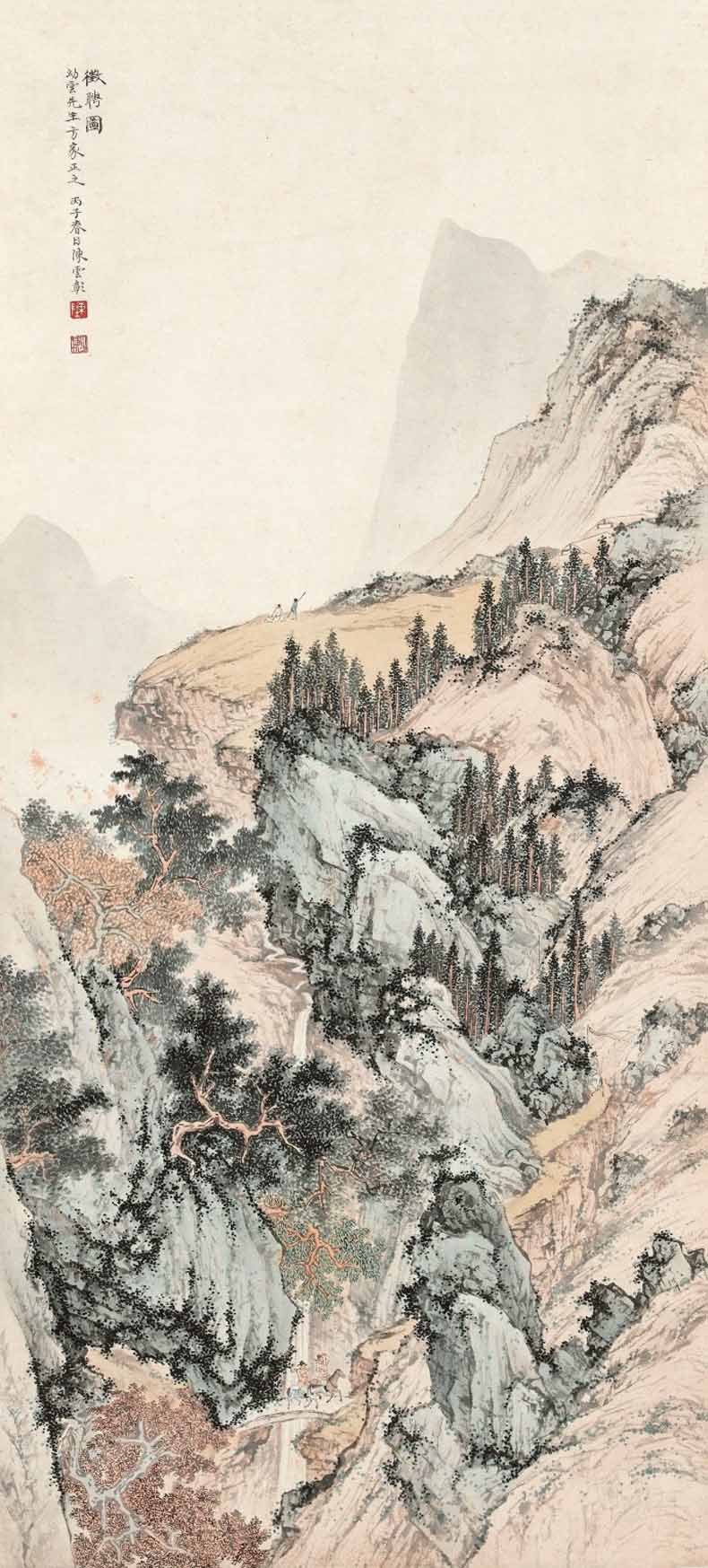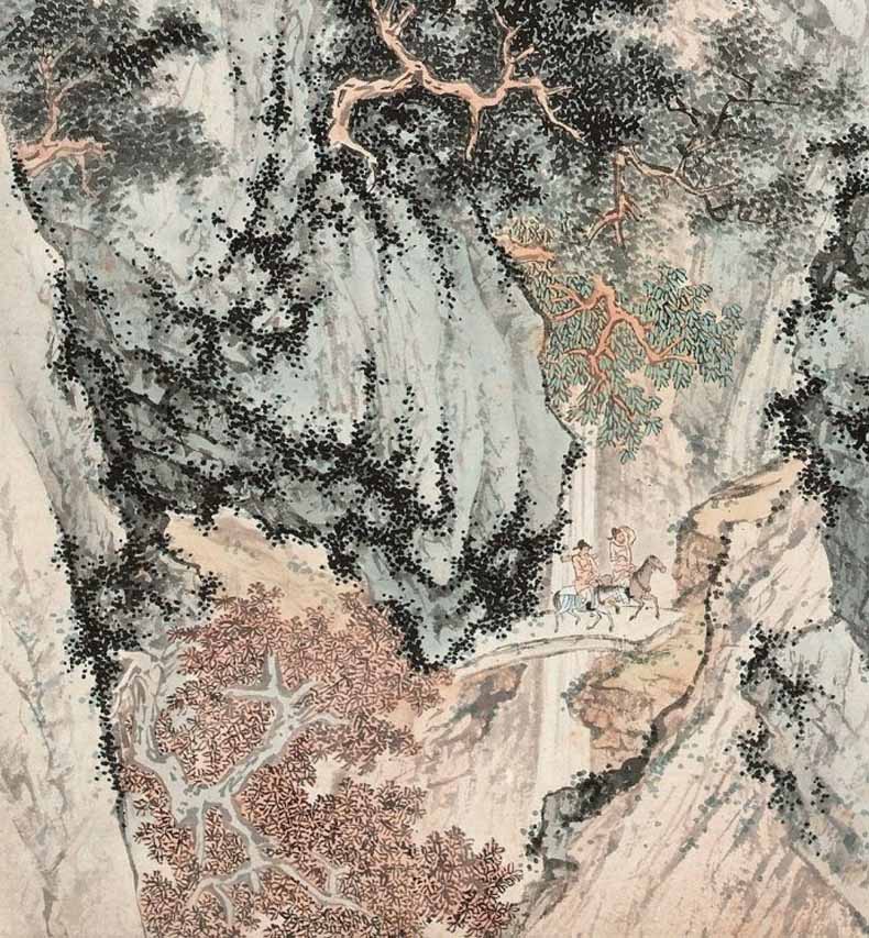 陈少梅在继承传统的同时又积极创新。其绘画虽宗北,却避其外露,力求在皴染上注入秀逸之气,讲究气韵生动,褪去烟火之气。第一阶段。早期,陈少梅的山水画主要学习马远、郭熙以及元人的绘画风格。其画风规矩,《征聘图》即为这一时期代表作。画面崇山峻岭、密林陡壑,山势起伏、崎峭陡越,山石结构繁密复杂但脉络层次分明,树木盘根错节,苔点、枝叶穿插其中。近处两位轻装使者策马而谈;中景崎岖山道中一位使者策马疾行,即将隐匿于山林之中;远处山顶的隐士悠然望向天空。人物的远近、动静关系与整幅画面景物相互结合,使画面丰富、饱满却不失灵动之感,令观者意远神驰。