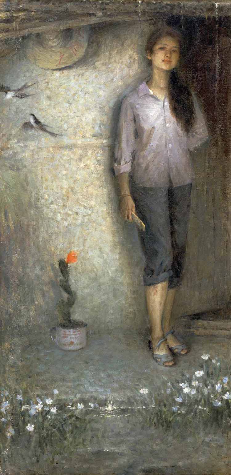 与后来的***、知青或其它题材中的女青年不同,《春》的着装是当年的城市装束,挽起的裤腿提醒在农村,是否暗示对生活的向往。后来,也包括当年,着装多是军装,刻意标识出时代特征,要不就是大红大绿的中国元素,屋檐下的草帽上“广阔天地”字样,标识出知青的身份。两只燕子隐喻着春天,后来更解读为满怀春天的希望。忧伤隐隐流露的双眼似乎诉说着普通家庭子女对前途的无望。一盆仙人掌或许是被生活抛到边缘的人们的一种顽强,那是画中唯一的亮色。
