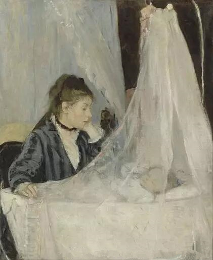 这幅《摇篮》是莫里索最为有代表性的画作之一,我们却并不知道它的背景故事。只知道画中的母亲是艾玛——莫里索的姐姐——和她摇篮中的女儿。这是莫里索第一幅描绘母爱及母性的作品,这一题材在之后成为她创作中很重要的主题。