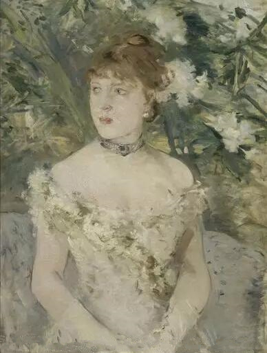 在这幅《舞会装扮的少女》中,模特置身于花朵围绕的环境里,胸前衣服的装饰与环境呼应。正如Charles所说,画面散发出一种美好恬静的氛围。因为结识一些印象派画家,莫里索之后把这幅作品卖给了意大利印象派画家朱塞佩·德·尼蒂斯。