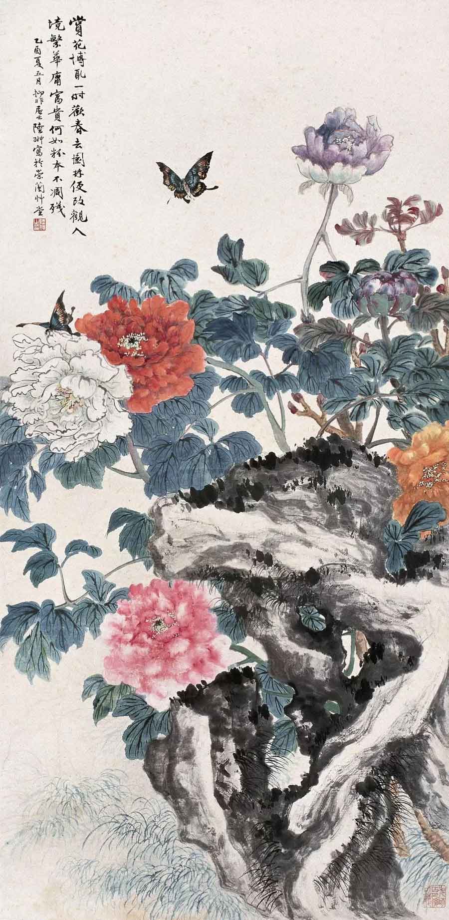 △陆抑非(1908~1997)1945年作 牡丹双蝶图