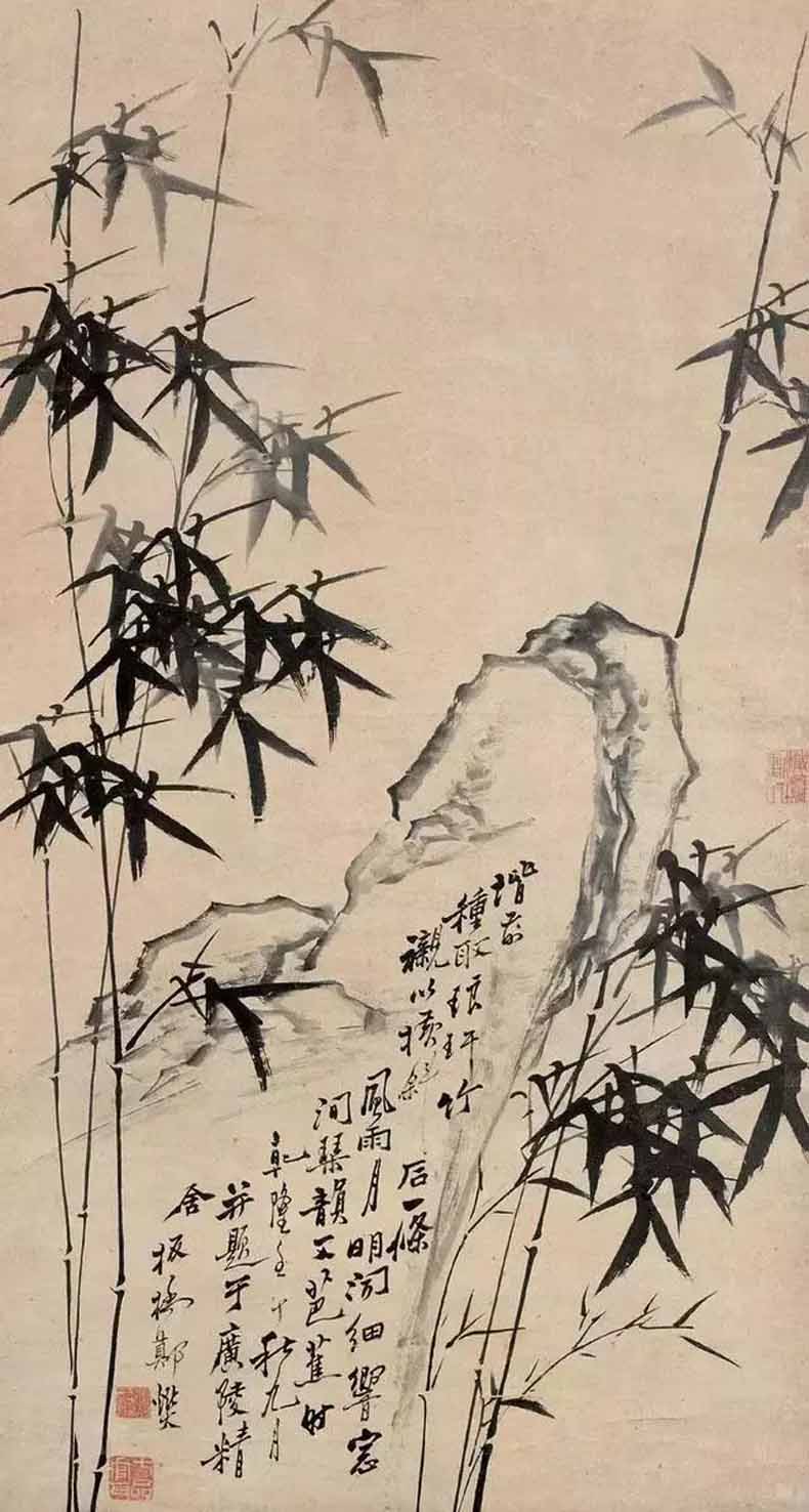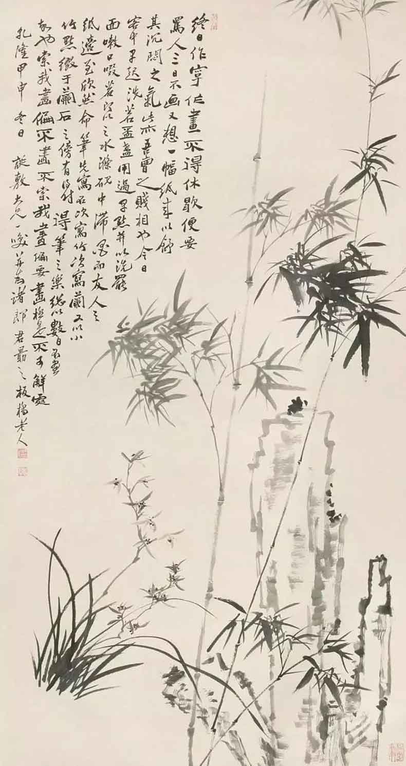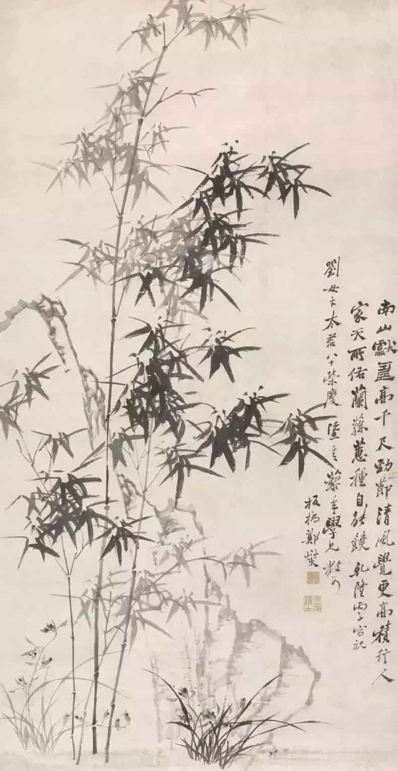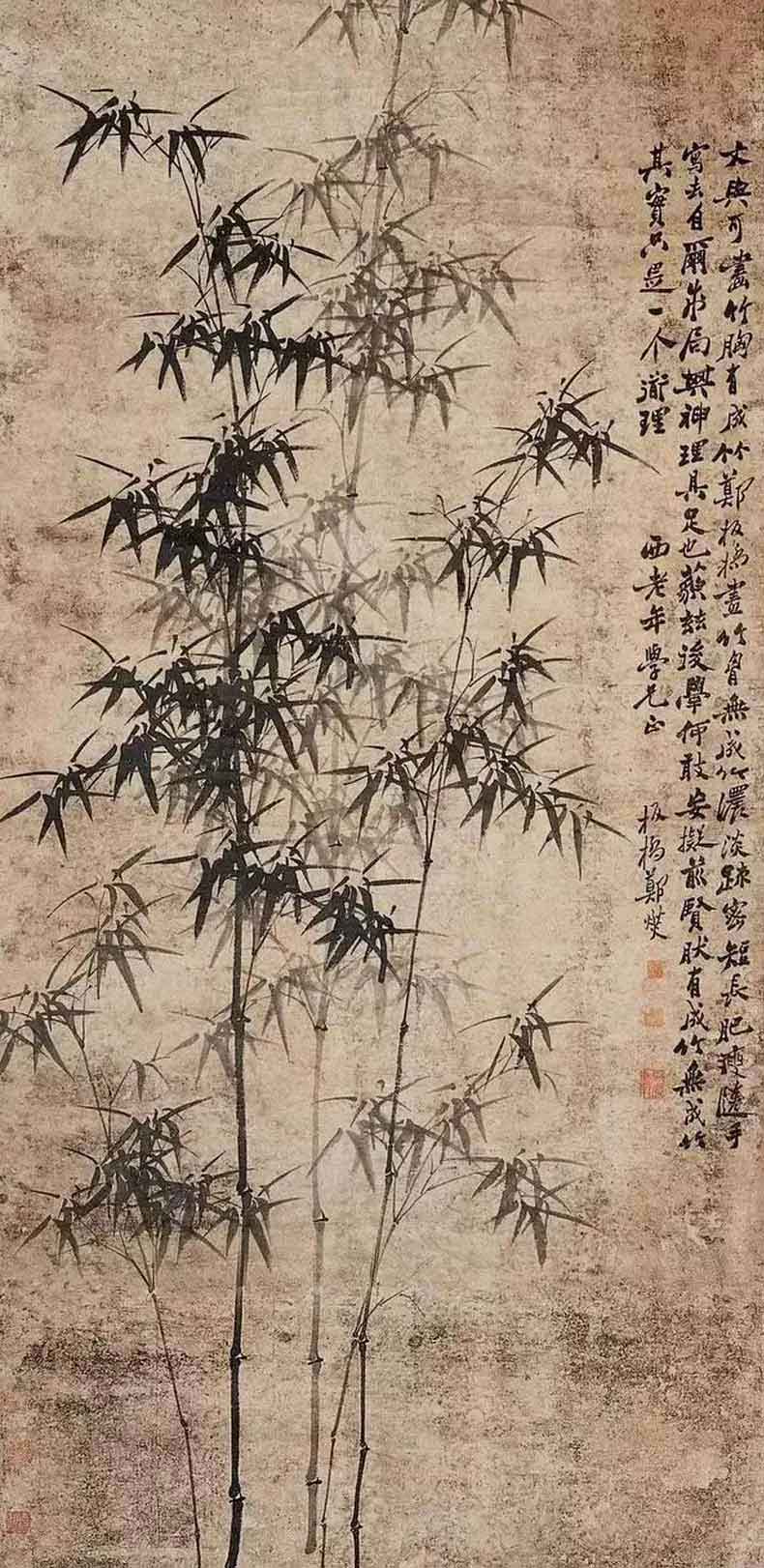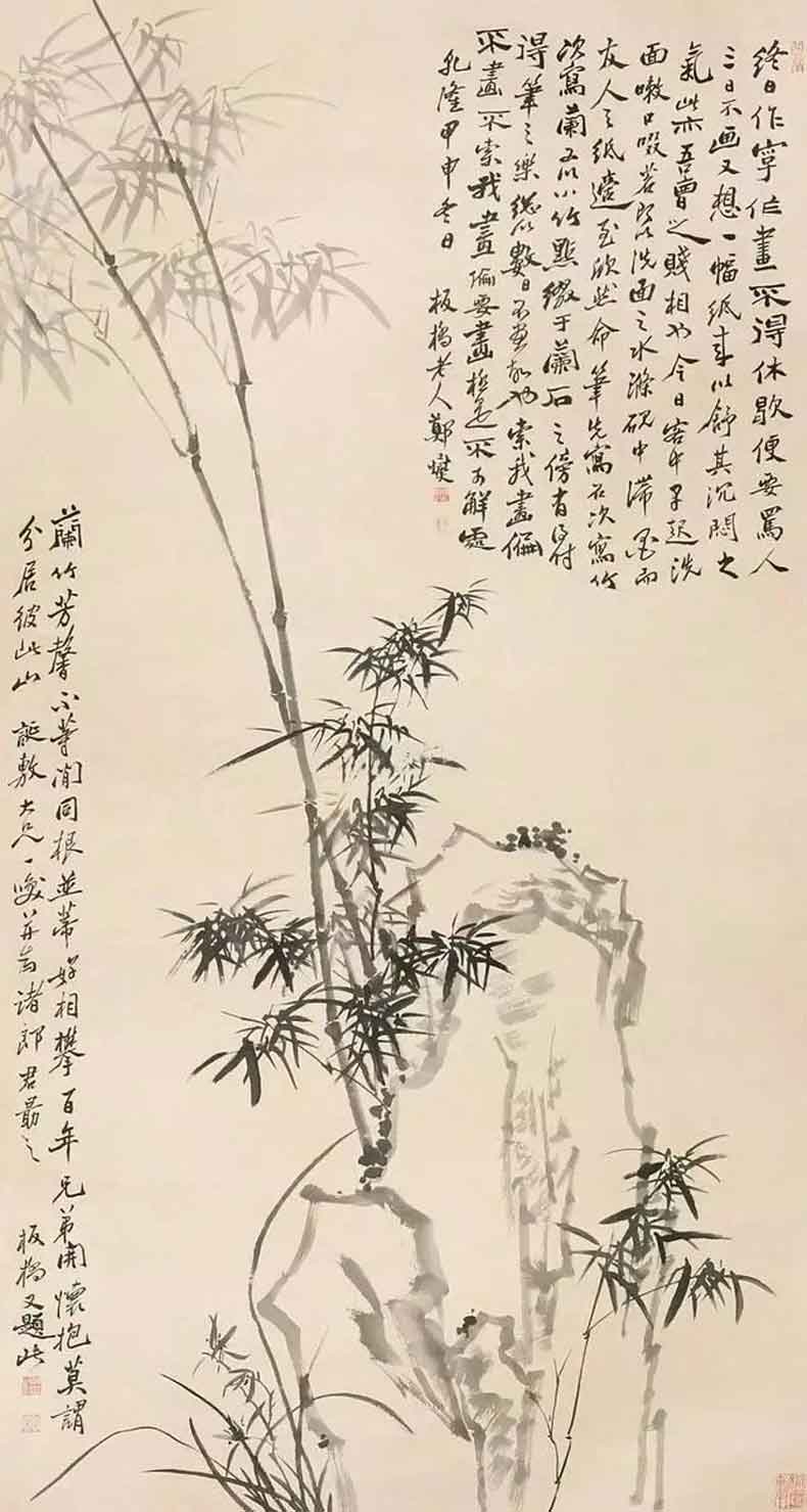 郑燮画竹因喜欢竹之气节,有题画竹句“屈大夫之清风,卫武公之懿德”。他画竹的三个阶段“眼中之竹”到“胸中之竹”再到“手中之竹”。用笔畅达遒劲,构图布局可谓“乱而不乱”,“疏密相间”,用墨“浓淡相宜”、“干湿并举”。