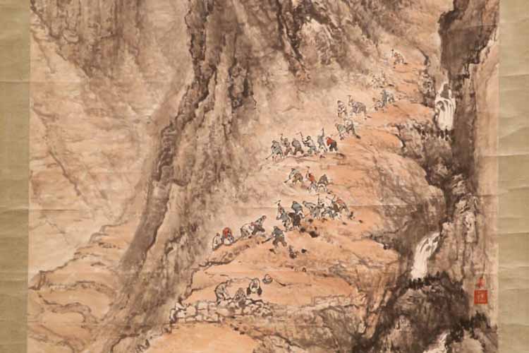 《山区修梯田》尺寸为245cm×108.5cm,创作于1958年,记录了“大跃进”时期陕南镇巴山区兴修梯田的宏大场面。《山区修梯田》被誉为“目前所知石鲁最大的山水画”、“石鲁艺术里程上的代表作”。