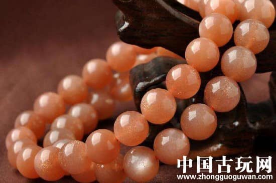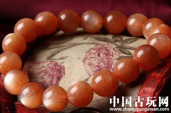 天然的日光石表面光泽艳丽,透明度高,可以呈现出金星效应,它的折射率在1.537-1.543之间,有半透明的包裹体,含有赤铁矿,内部结构呈长板状。假的日光石光泽不够亮丽,闪光点超强,内部还有很多小气泡。