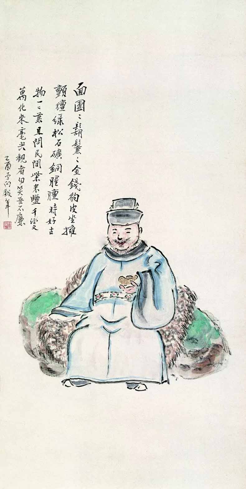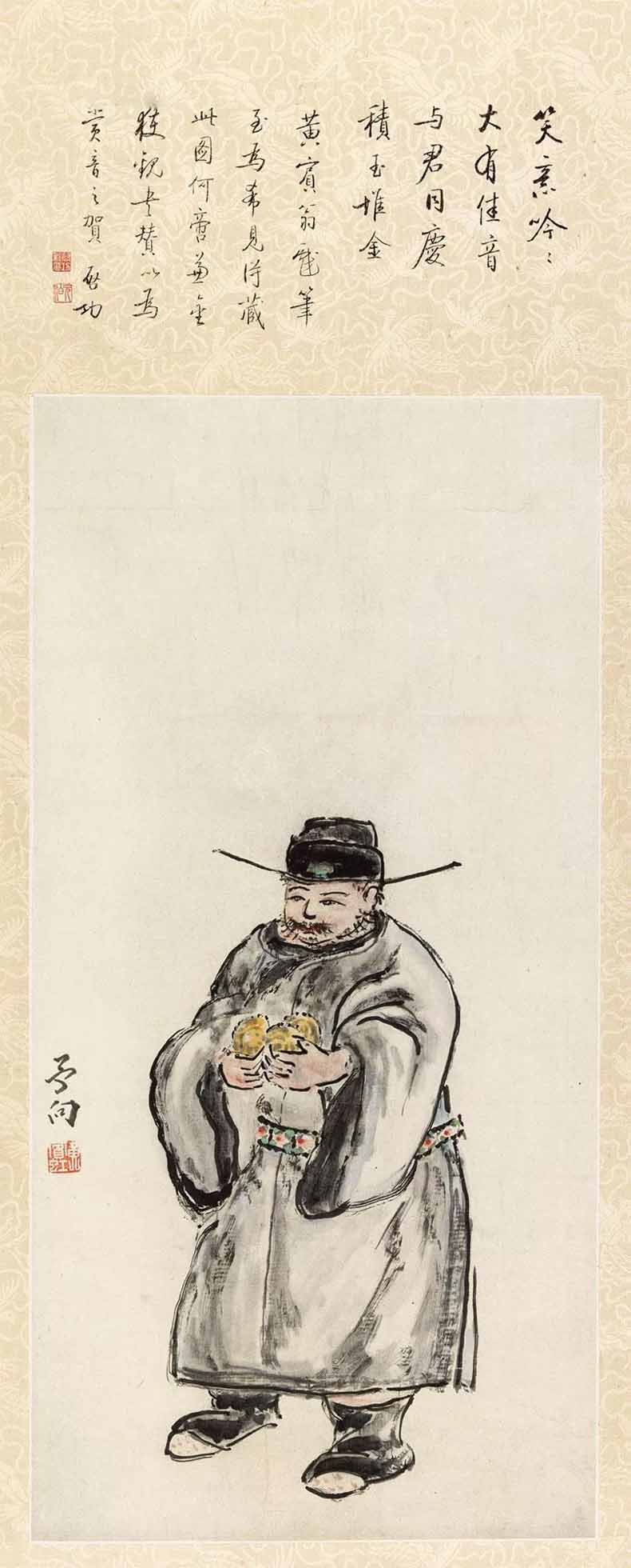 黄宾虹人物画世所罕见,此幅写财神,怀抱金玉,喜气洋洋。再就立意而言,黄宾虹常见的作品,或崇高、或萧散、或深邃,而出之以谐趣者,恐怕此图也是唯一的例证,恰足见画家性情之丰富多面。