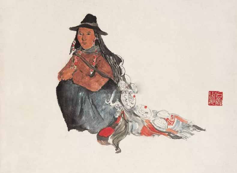 这是一幅水墨写生作品,以墨线勾勒,淡彩渲染,其用笔婉转流利,极富表现力,而人物比例准确,形体结实,比较忠实于真实的对象,显然又具备西画的色彩。以水墨再现客观物象,是这一时期中国画的一个重要倾向,从《藏族妇女》中不难看到时代精神对画家的影响。