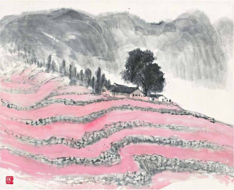 1950年代,石鲁频繁地赴陕南、陕北农村写生。《梯田人家》即是描写黄土高原的梯田风光,画中梯田以焦点透视布局,前景开阔,直扑眼帘,后慢慢聚于画面左上处。坡面以少许朱砂、赭石淡淡铺染,以现黄土地的色彩和松软的质地,梯田的坎面则是用浓淡和粗细不同的墨线,相互交错,皴擦出不同明度的石块肌理。梯田层层向上,将人的视线引至高处的一处村落。农舍屋顶呈人字形,屋檐外伸,粉墙青瓦,墙上写着“建设山区”四个大字,突出时代背景。村前几个小小的剪影式人物,赋予画面生活气息。村中一棵大树,以淡墨铺形,再以浓墨重笔点染,在画面中尤为醒目。村后参差的树木随山脊远去,只以淡墨染出大形,且愈远愈淡,直至与远景融为一体。远山以水墨稍加赭石染成,富于浓淡变化,山脚留白,显得云霭苍茫,意境悠远,单纯的背景将梯田和村落衬托得更加突出。