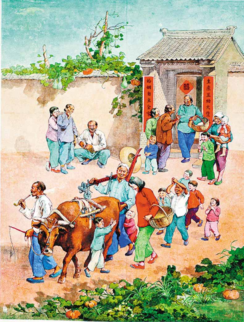 在20世纪50年代初的年、连、宣绘画作品中,有相当一部分表现了“幸福婚姻”题材。石鲁创作于1952年的新年画《幸福婚姻》直接指向这批婚姻题材作品的核心内涵。“幸福婚姻”在当时语境下应该是什么模样?石鲁的作品描绘了一个农家小院院外的场景:院墙上和画面右下角是连绵不绝的南瓜和葫芦,寓意多子多福;一个吸烟斗的老汉牵着牛走在最前方,一对年轻夫妇紧随其后,周围簇拥着一群孩子。远处是三五成群的乡亲。院门上的春联点明主题:“生产互助大丰收,婚姻自主全家福。”生产互助、婚姻自主意味着当时幸福婚姻的保证。当年许多画家,包括中央美术学院的画家群也介入了这个题材的创作——《新式结婚》《新娘子讲话》和《夸媳妇》是其中的代表作。