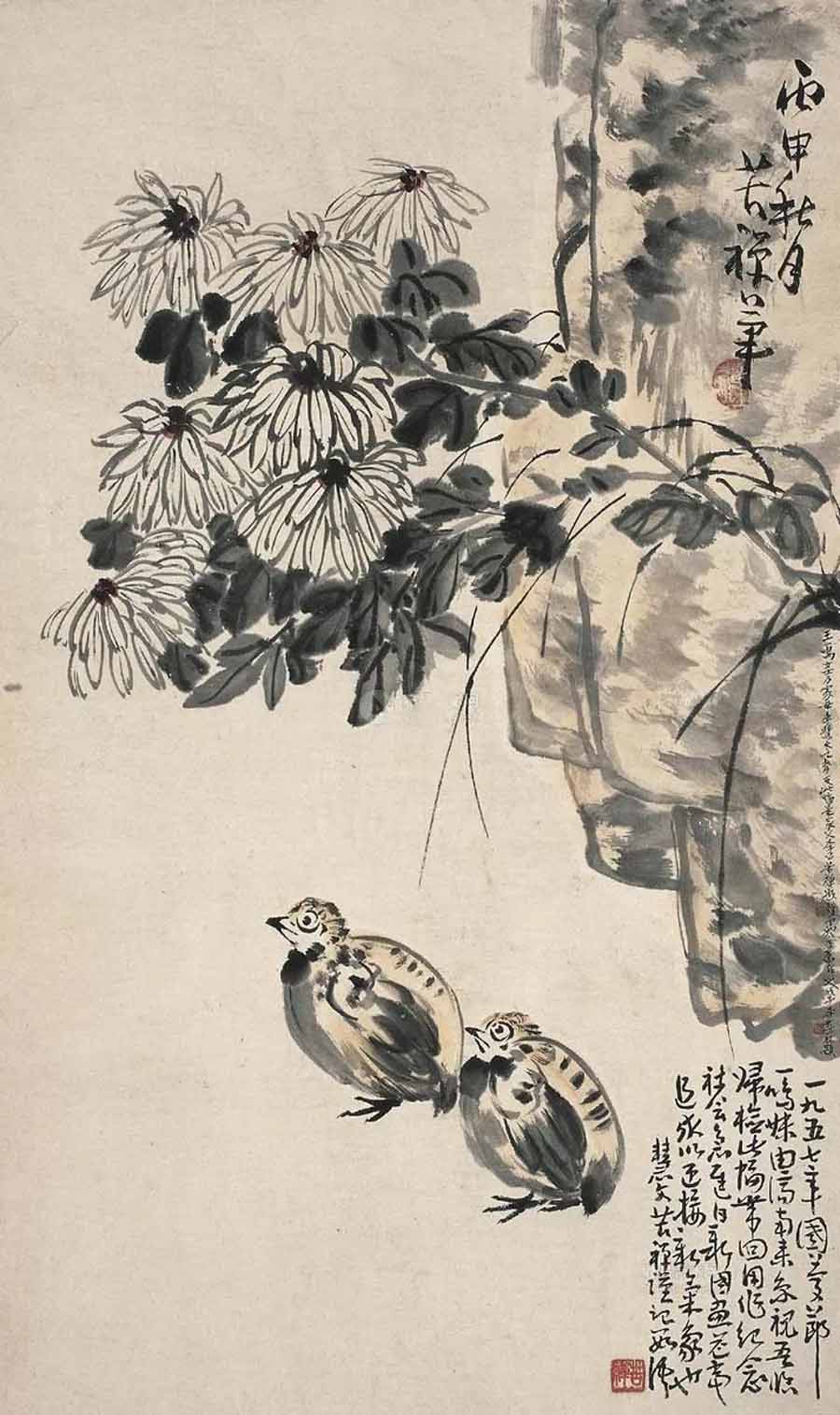 △李苦禅 1956年作 丛菊双鸠图 82.5×50cm