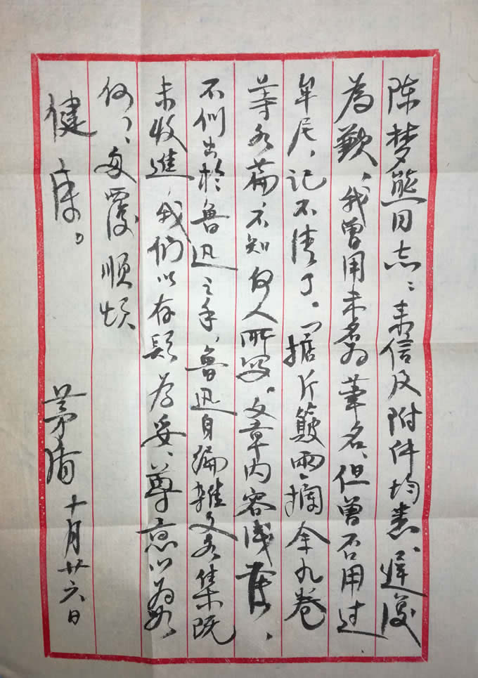 写信人:茅盾,本姓沈,幼名燕昌,名鸿,学名德鸿,亦作雁宾、雁冰。新中国成立后,当选为中国文联副主席、作协主席,任第一任文化部长,历届全国人大代表、全国政协常委和第四、第五届副主席。