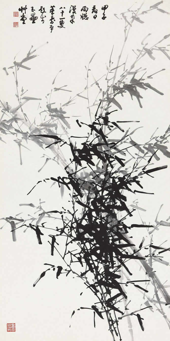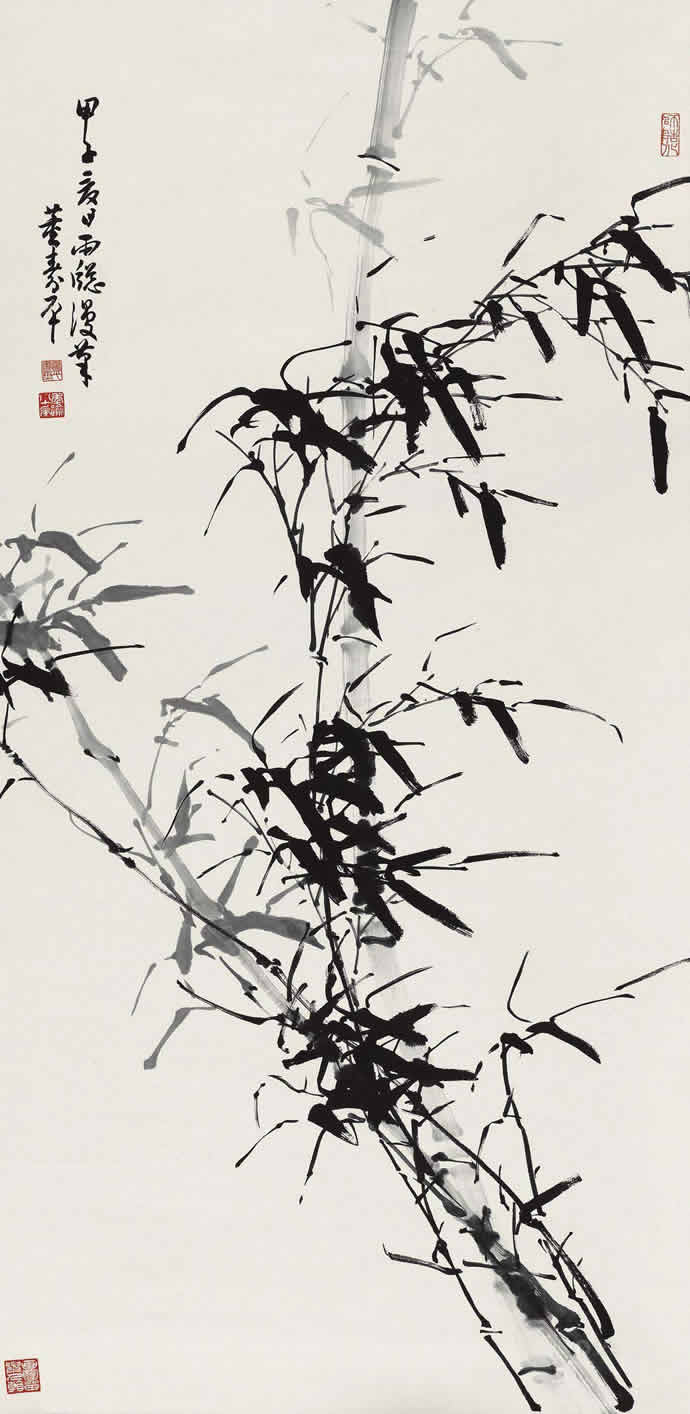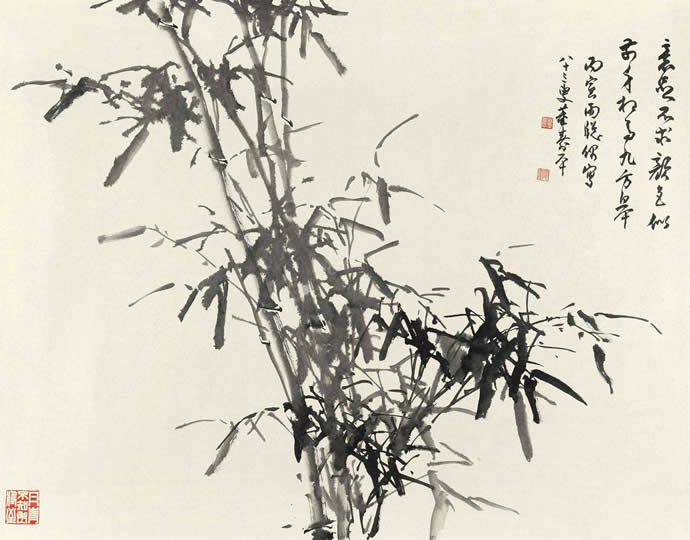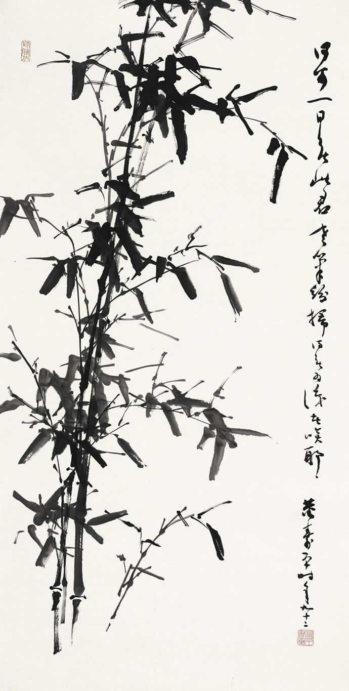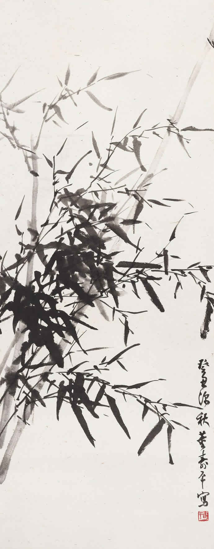 古人把画竹称为“写竹”。一个“写”字包含着两种意义:一是画竹的用笔形式与中国书法最为接近,没有扎实的书法功底不可能把竹子画好。欣赏董寿平笔下的竹子,一个“力”字贯穿始终,充弥于整个画面。无论是顶天立地的长竽还是画中局部的末节枝梢,都充满着力量,那种斩钉截铁般的笔力,足见他在书法上的超然功力。