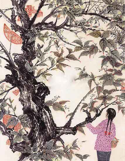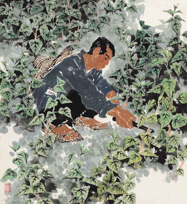 《采桑图》表现了一位身着青衣花裤的少女,侧身倚坐在桑枝旁专心采摘桑叶的情景。密密铺排的桑叶用没骨法画成,笔意粗放。其间绘有多方形状各异的印章,与桑叶桑枝的角度配合的严丝合缝。这些点缀在青绿色调画面中的点点朱红,成为画面的有机组成部分。整幅画作充满了清新明快的田野气氛,是石鲁绘画中田园题材的代表之作。