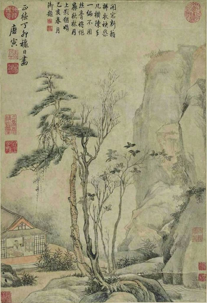 此镜心乃设色纸本(见图),画心虽非巨制(86×40厘米),却淡墨渲染出了别有洞天的一方世外桃源之境。画面清静旷达,构图清爽简约,有限的方寸之上,有山有水,有树有草,有舍有人,峻峭凌立的山崖一角,苍苍挺立的老树之下,一所书斋豁然其间,悠然自得的文人凭几眺望,若有所思,怡然自乐,似乎在欣赏不远处的醉人美景,窗下一丛花叶兀自茂盛,咫尺之距的溪涧水声潺潺,清风徐来,好不惬意!古松树干以中锋绘就,线条明朗,毫不含糊,曲折但遒劲有力;松针精微纤细,凛冽刚劲;枯枝虽败,昂然伸展,颇具槎桠之美韵。画幅左上角留白处,是唐寅秀美的行书题款:“正德丁卯秋日画,唐寅”,钤盖“唐居士”“唐寅私印”两方。
