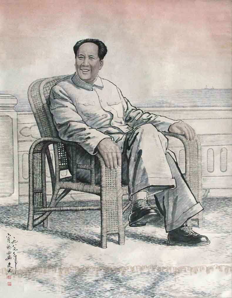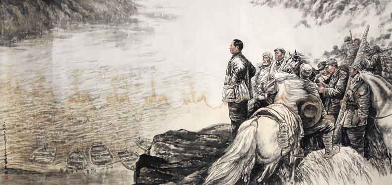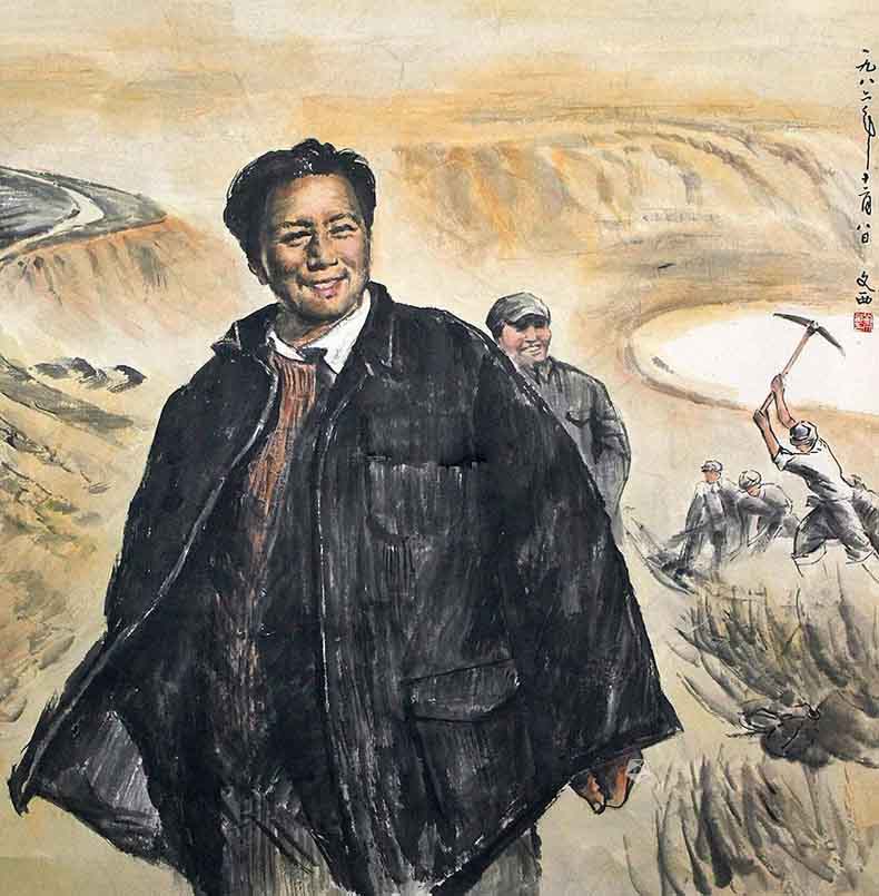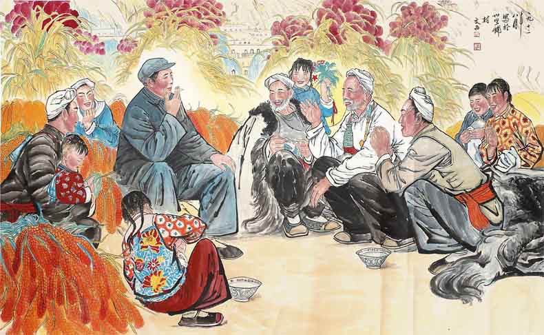 一天,他在延河畔写生,见到一位牧羊老汉赶着一群羊从沟坎上走来,头巾、胡子、皮袄、腰带,让他一下子想到曾看过的***在杨家岭与老百姓交谈的照片。他走访了***当年去过的村庄,找到了杨家岭的生产队长,了解***怎么和农民交谈、谈了些什么内容,人物更加立体丰满。为了画好羊,他也想出了法子。“山羊爱往上跑,我就要站在比它们更高的地方画画;绵羊爱钻石头疙瘩,如果它要跑的话,我就往羊头上扔小石头,它就会回头。”几次下来,羊群安分了。“它踏实了,我就踏实了,就可以画画了。”