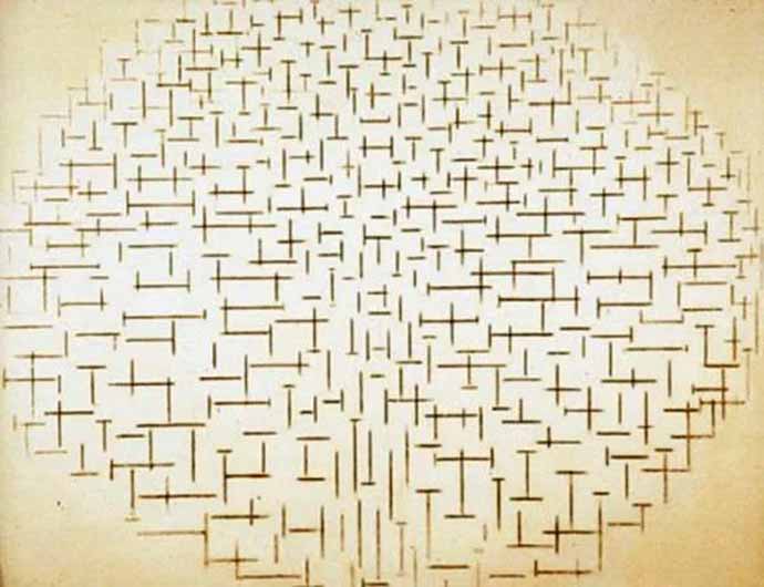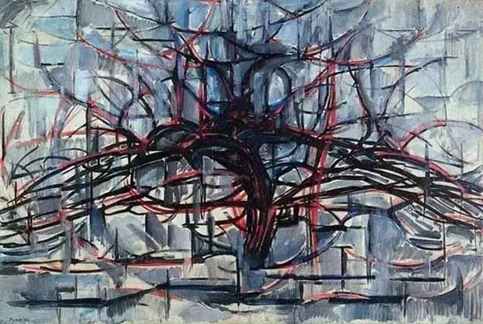 在十七岁之前,蒙德里安是在他的叔父福尔兹·蒙德里安的指导下学习绘画。福尔兹是一位海牙画派的画家,因此蒙德里安得到写实浪漫的真传。早年,他画过写实的人物和风景,后来逐渐把树木的形态简化成水平与垂直线的纯粹抽象构成,从内省的深刻观感与洞察里,创造普遍的现象秩序与均衡之美。他崇拜直线美,主张透过直角可以静观万物内部的安宁。