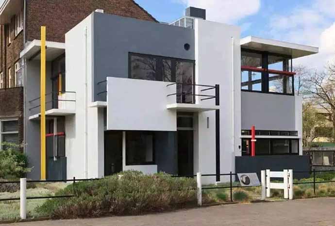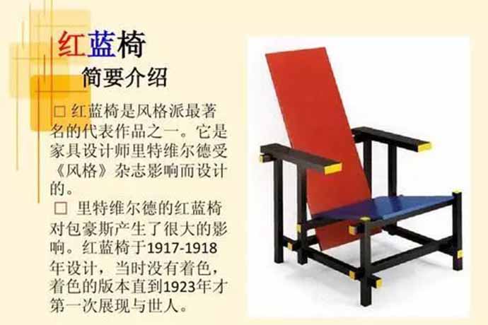 所以,在他的作品中就只有红、黄、蓝三种颜色和水平线、垂直线两种线条,而且这些元素被组织在某种理性控制的结构中,与某种客观的规律性结合。“红、黄、蓝”的绘画风格不仅体现了一种理性主义的完美思想,更被认为是影响后现代主义风格绘画思想的渊源之一。在“红、黄、蓝”绘画风格的影响下,建筑界和家具设计界也对此有了相应的反应。风格派建筑师利特维德设计的“红蓝椅”和乌德勒支住宅成为蒙特里安绘画的立体版。