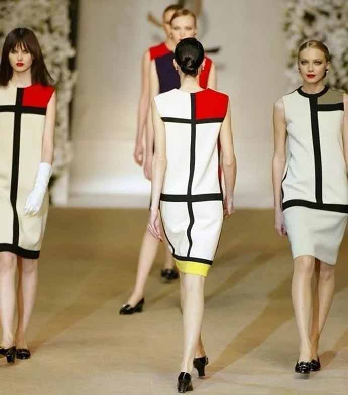近年来,时装设计界也毫不收敛的刮起一阵艺术狂潮,时装设计大师伊夫·圣·洛朗在2002年的告别秀上沿用了蒙特里安的“红、黄、蓝”绘画,将“红、黄、蓝”的构成形式几乎原版不动的搬到他的时装设计当中,由黑线加红、黄、蓝、白组成的四色格纹成为世界时装史上的经典之作。