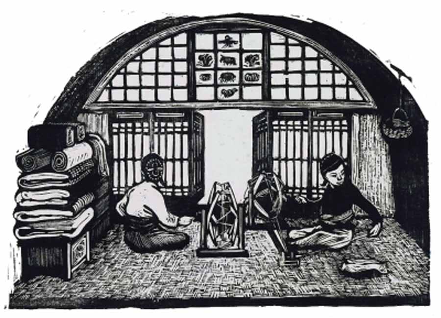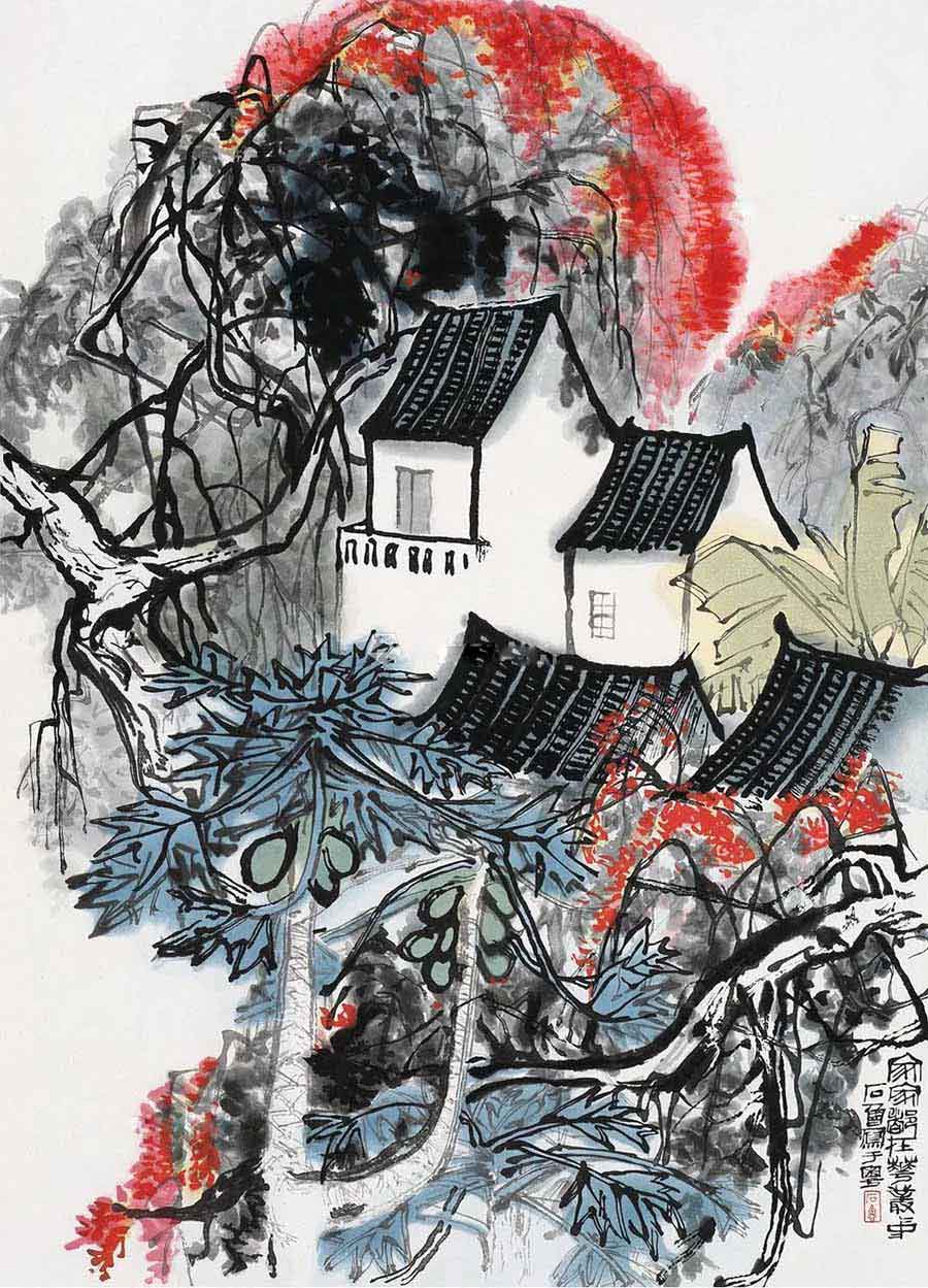 石鲁版画《家家都在花丛中》绢本 59.5×43cm