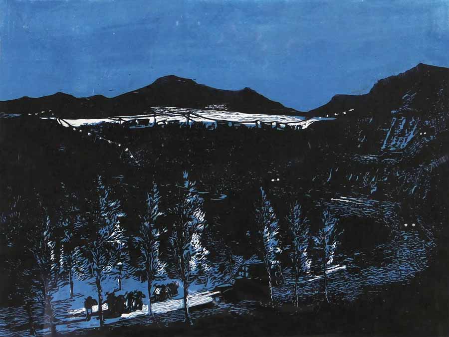 石鲁版画《兰新铁路之夜》25.3×52.5cm