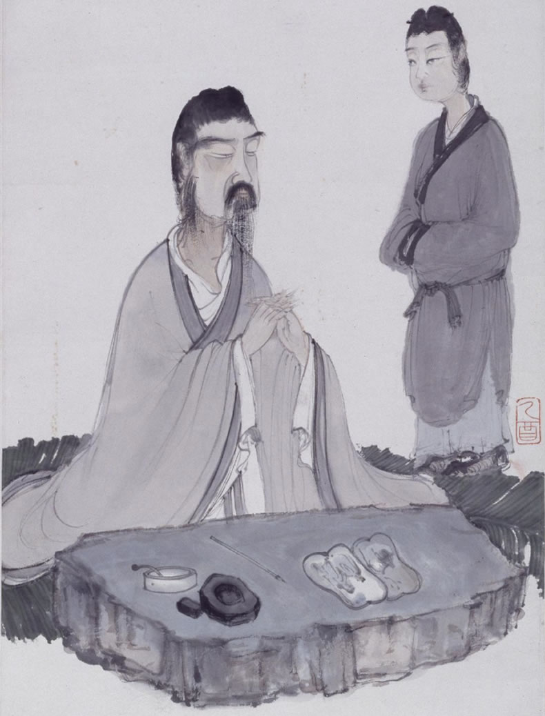 图中表现一位画家刚刚完成两幅扇面,闭目叉手,凝神静气,似在回味创作过程中的得失。四句像赞皆有所指:“寄生晋宋,携手商周”言其仰慕前贤,心倾仪范,性喜古物,情趣高雅;“松烟隺管,以写我忧”言其以手中笔墨排遣充斥胸臆的种种情绪。由此看来,傅抱石为画家造像的目的实则是以其自况,表达出个人的志趣与追求。