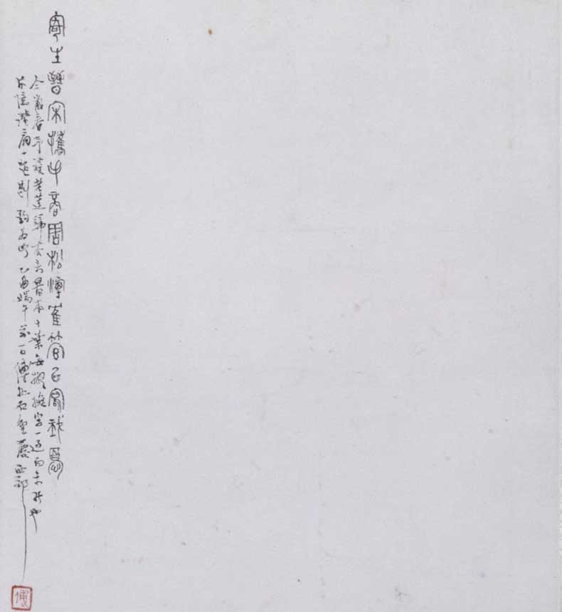 本幅自题:“寄生晋宋,携手商周,松烟隺管,以写我忧。今岁春,予读老莲归去来景本十叶,每拟抚写一过而未能也。兹忆赞扇一题,斟酌为此。乙酉端午前一日,傅抱石,重庆西郊。”钤“傅”朱文长方印、“抱石大利”白文方印、“乙酉”朱文长方印、“其命维新”朱文方印。