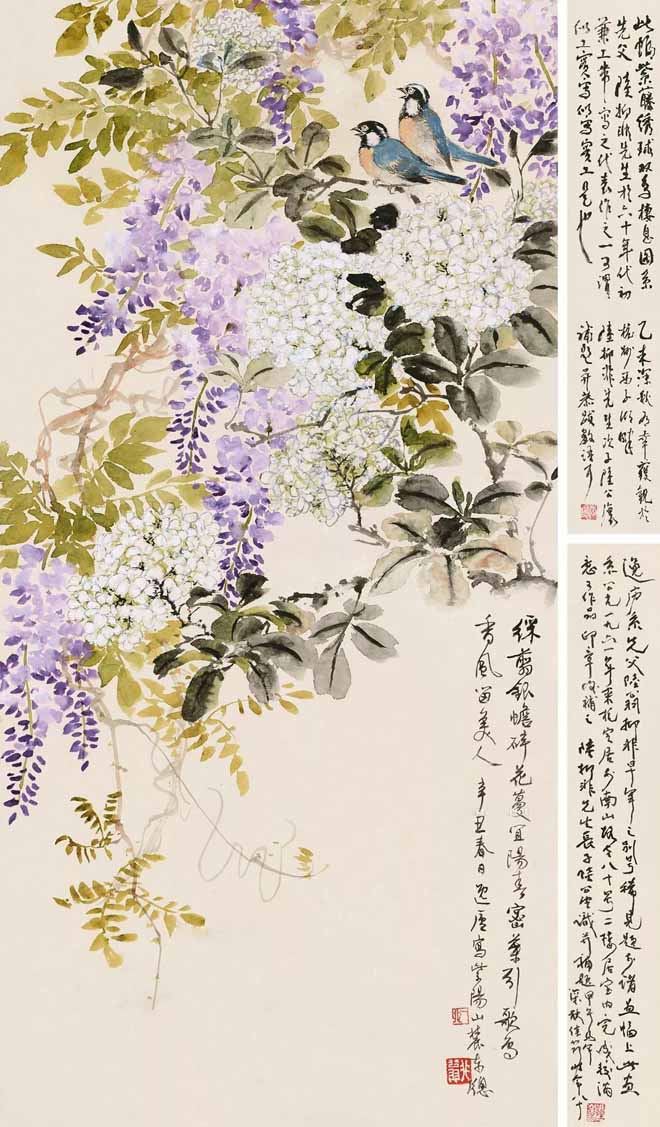 △陆抑非(1908~1997)1961年作《紫藤双禽图》83×51cm