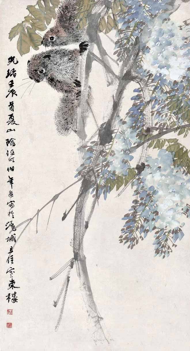△ 任伯年(1840~1896)1892年作《紫藤松鼠》68×37cm