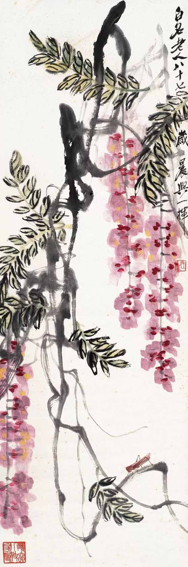 △齐白石(1864~1957)《 紫藤蚱蜢》102×34cm