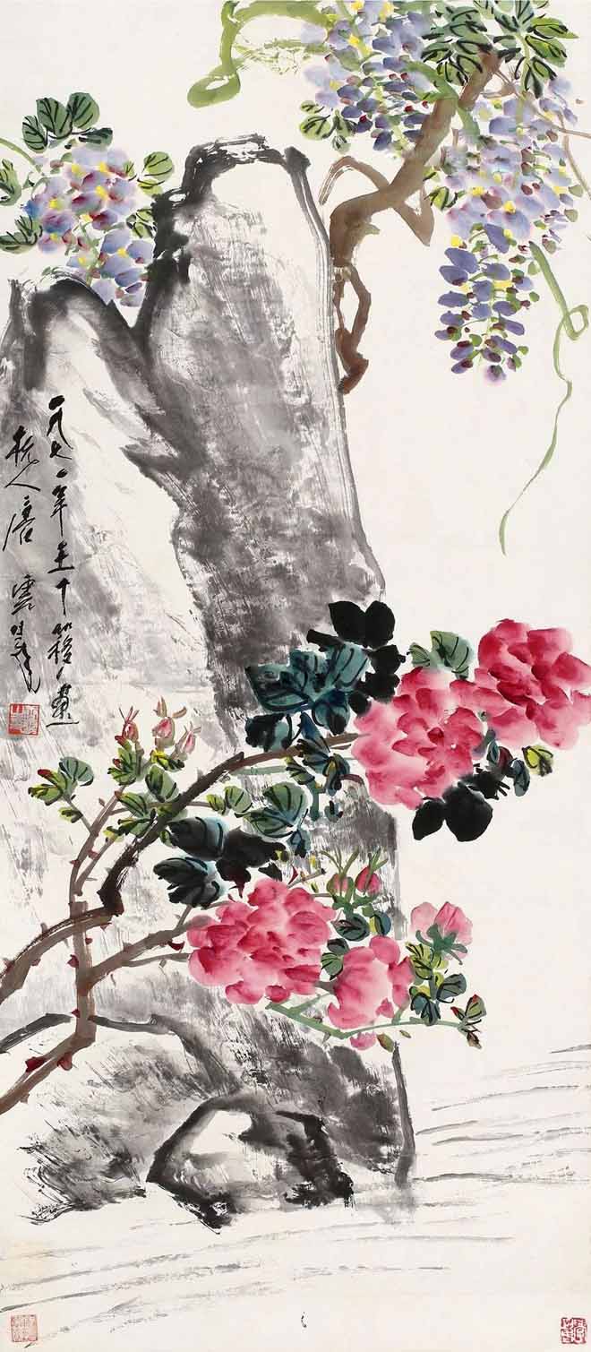 △王个簃(1897~1988)1971年作《紫藤红花》99×43cm