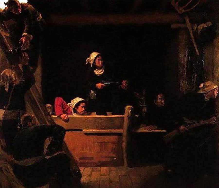 《地道战》的场景被设置在晦暗狭小的空间内,画面中几位民兵准备战斗的瞬间极具动感和真实性,特别是画面中心,手持驳壳枪站立的女指挥员神情专注而紧张,让观者的情绪被画中人物所感染。罗工柳巧妙地运用人物向上、向外的视觉方向以及体态动作,既拓展了画面的空间,也将这种特殊的游击战形式表现得十分生动,让观者的焦点有了向外的联想与延伸。同时,为了表达正义的信念,画家将画面处理为柔和的暖色调,天窗投射的光线及身着红衣的女子洋溢着温暖的感觉,渲染出光明必胜的坚定意志。在创作油画《地道战》时,正值罗工柳创作的黄金期,十几年后,这一题材才被搬上了银幕。