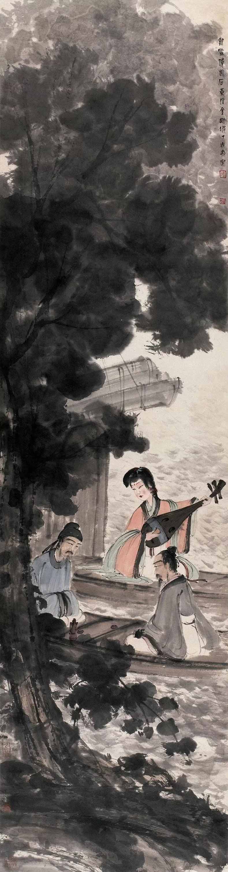 傅抱石对《琵琶行》的推崇,对古典诗歌题材的回归,并在这种回归中融入新的因素,无疑是符合艺术创造规律的。《琵琶行》诗中流淌的旋律,被他用丹青圣手绘制成一幅幅杰作,在很高的层面上,使诗、书、画都实现了雅俗共赏。人们在品赏这些作品的同时,亦可品味这千古不朽的名篇。