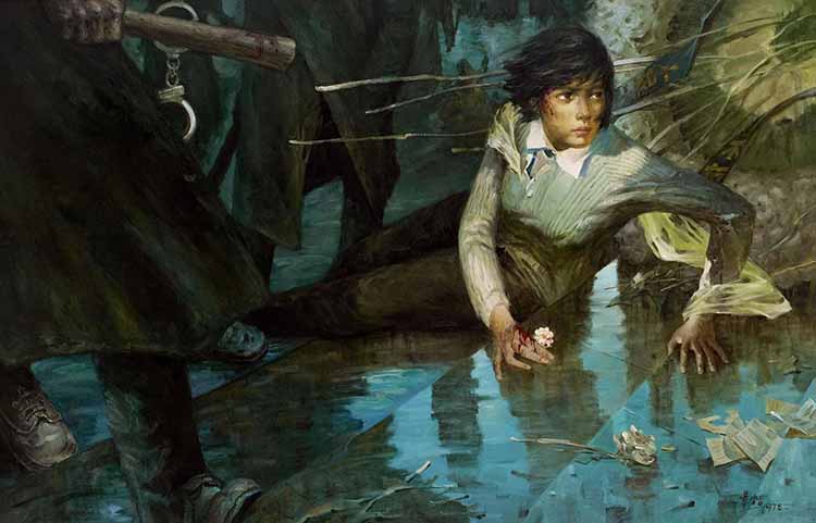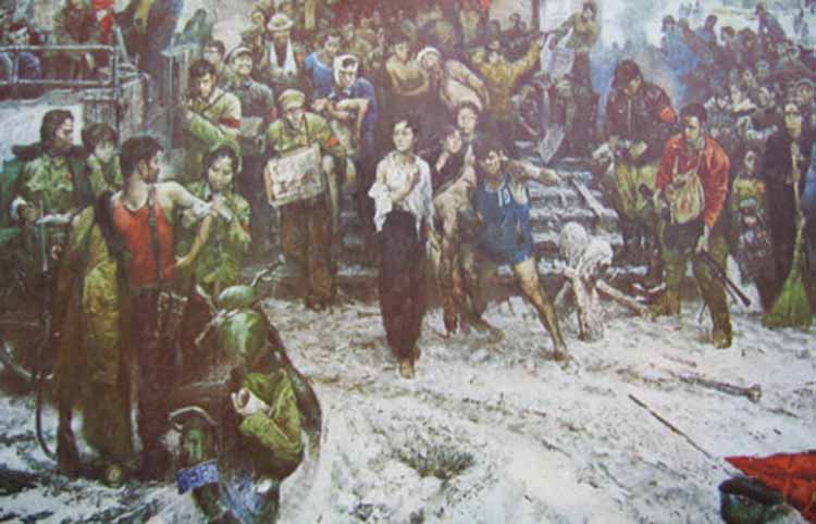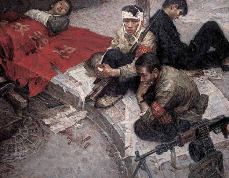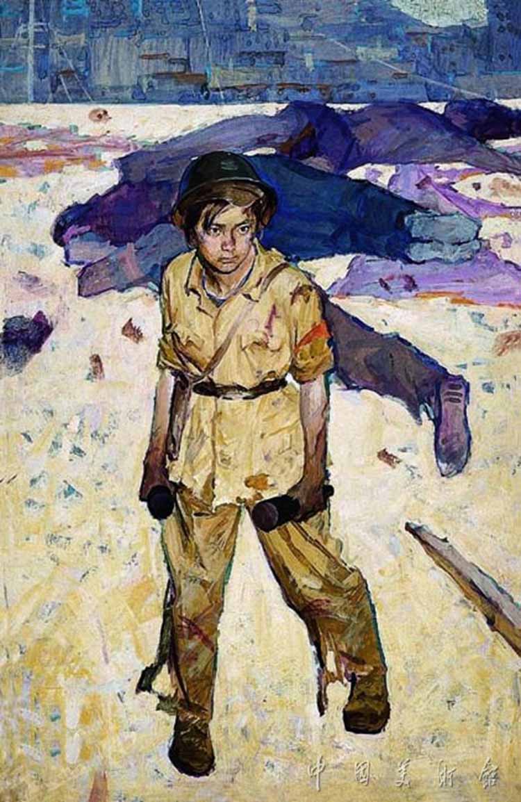 蔡景楷的《真理的道路》,实际上表现的就是76年的“***”。那个时候大家为了悼念总理写诗歌。当时有《天安门诗抄》,有些诗写得非常精彩,表达了人们对总理的一种思念,但是这个活动遭到了***。这个画就是这样子的,一个跟大家的年纪相仿的女孩,她一定要把这朵白花给献上去,她的头已经被打破了。拿着警棍,拿着镣铐的人这样的一些处理方法,表现了当时人们还是坚持真理,有所追求的。