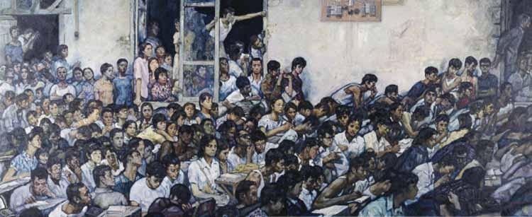 程丛林的作品《一九七八年夏夜》,老师是很希望看到这样的场景的。当时人们那种对知识的渴望,确实是真实的,你们可能不知道,77级、78级的那批人,他们那个年龄一个班里的年龄差很大,有的已经是孩子的爸爸、妈妈了,然后还来读书,在同一个教室里学习,这种情况在当时是真实的。