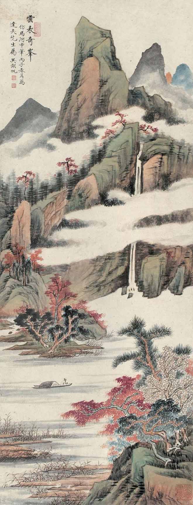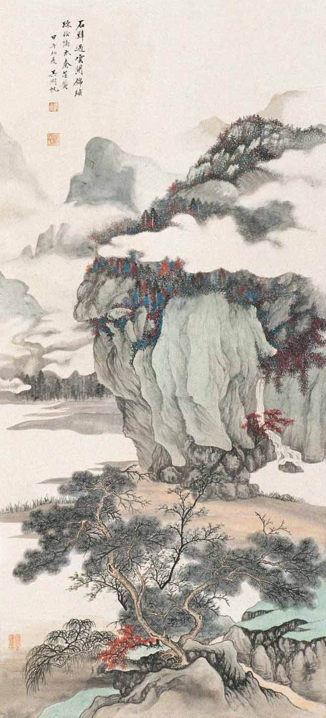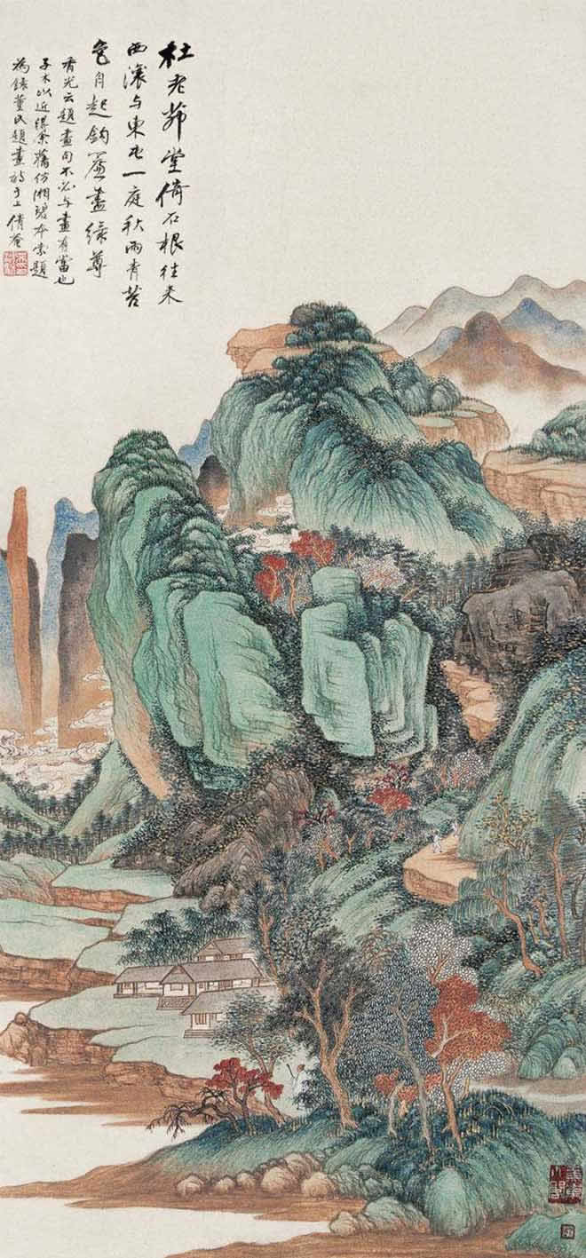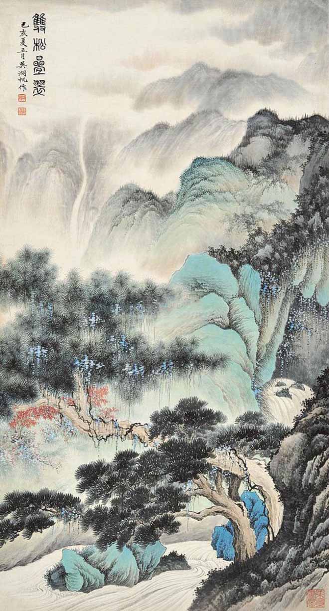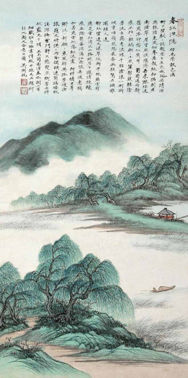 吴湖帆,江苏苏州人,为吴大澄嗣孙(1894—1968)。吴湖帆以其雅腴灵秀、清韵缜丽的画风自开面目,称誉画坛。上世纪三四十年代,吴湖帆更以其出神入化、游刃有余的笔下功夫,成为海上画坛的一代宗主。他的“梅景书屋”则为江浙一带影响最大的艺术沙龙,几乎当时著名的书画、词曲、博古、棋弈的时贤雅士都曾出入其中。他的青绿山水画,设色堪称一绝。