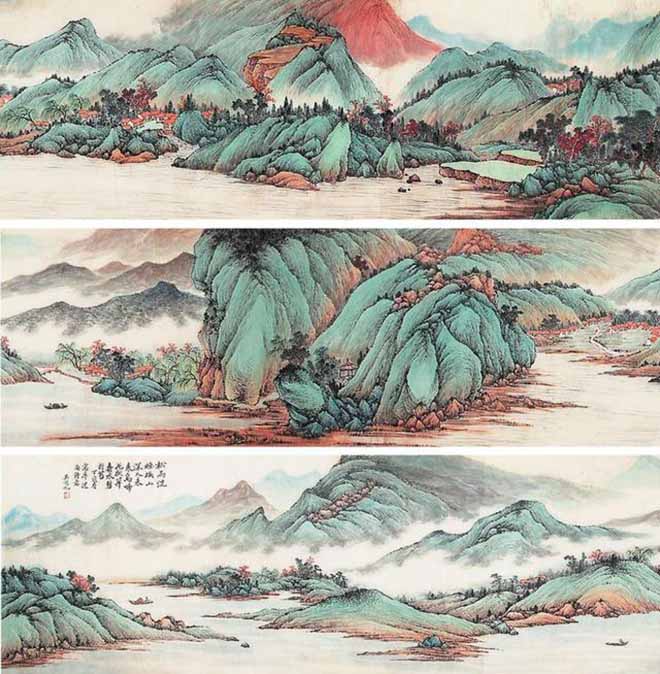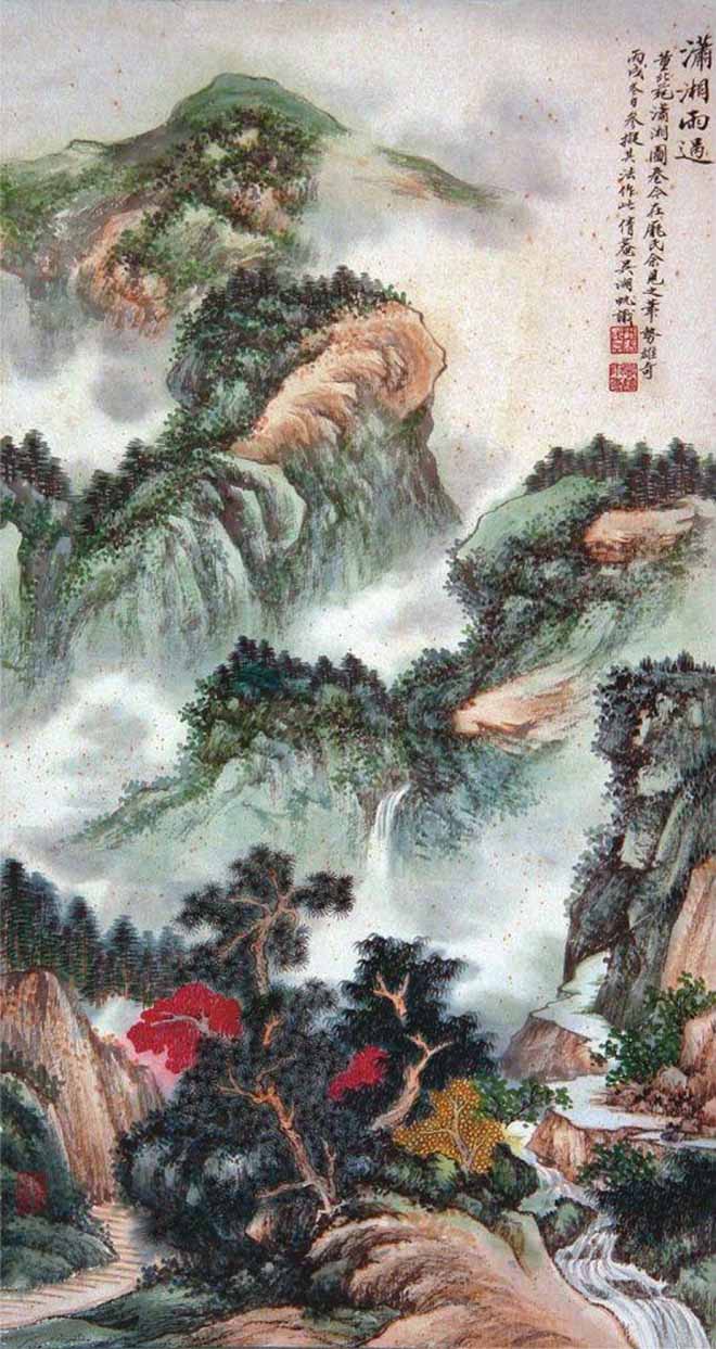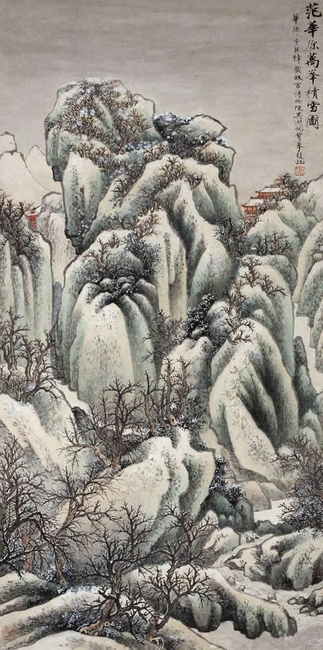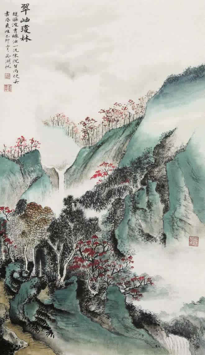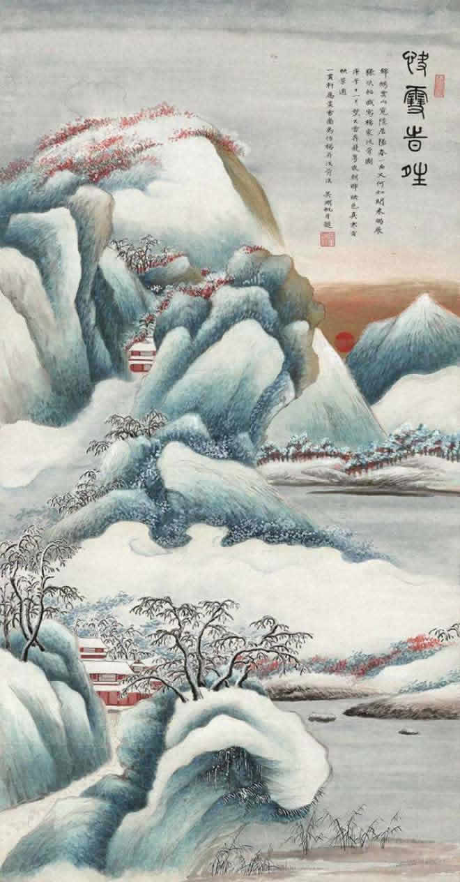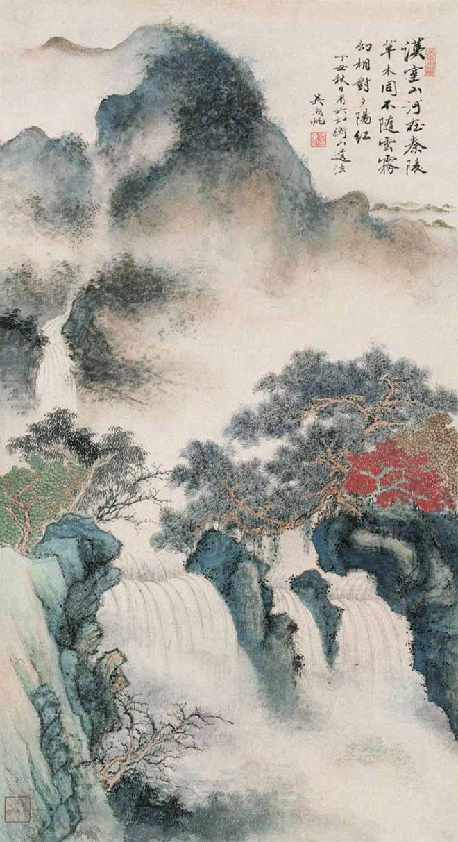 吴湖帆,江苏苏州人,为吴大澄嗣孙(1894—1968)。吴湖帆以其雅腴灵秀、清韵缜丽的画风自开面目,称誉画坛。上世纪三四十年代,吴湖帆更以其出神入化、游刃有余的笔下功夫,成为海上画坛的一代宗主。他的“梅景书屋”则为江浙一带影响最大的艺术沙龙,几乎当时著名的书画、词曲、博古、棋弈的时贤雅士都曾出入其中。他的青绿山水画,设色堪称一绝。