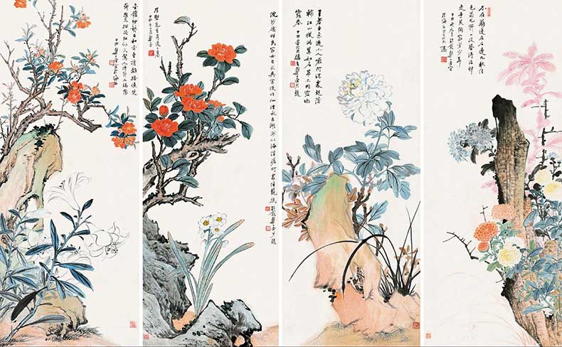 △郑午昌 1944年作 四时花卉 94×37cm×4
