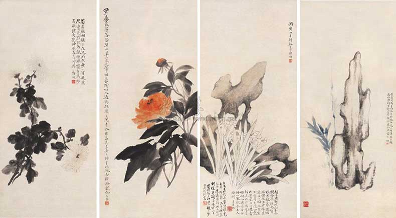 △郑午昌 1926年作 花卉 80.8×36.3cm×4