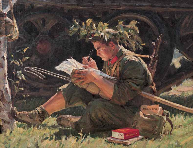 一个小战士,头戴树叶扎成的“草帽”,背着步枪,坐在坦克边,正利用训练的间隙专心致志地写“批林批孔”文章。活灵活现的人物造型,扑面而来的青春气息,明快的色调,漂亮的光影,使看到这件作品的人无不为其新鲜而充满活力的画面所吸引,而其中的“***”政治气息反而被人们忽略了。