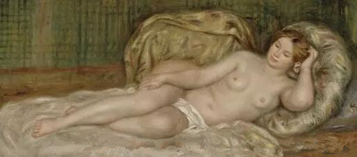 女性裸体也是雷诺阿热衷于描绘的题材。而比起室内,他又更多的描绘了室外自然光线下的场景。1890年之后可以算雷诺阿最后的艺术创作时期,在此期间,他再次回到早期的风格,集中于裸体和家庭场景的描绘。画中女子身材丰腴,画家选择用更为细腻的笔触和简单的色彩来表现,而不再是颤动的笔触和丰富的色彩变幻。女子浸在柔和温暖的光线里,身体舒展在柔软的靠垫上,像一件被置于天鹅绒首饰盒中。而其姿态高贵,像安格尔的《大宫女》或马奈《奥林匹亚》中的宫女。这幅画现展出于橘园美术馆,它代表着雷诺阿对古典艺术的继承。之后的二十世纪,马蒂斯和毕加索等艺术家从雷诺阿的女性裸体中获得了很多灵感和启发。