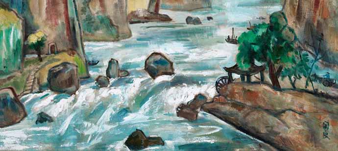 《石门》画的是陕西的石门洞,是关良根据抗战时赴西北沿途写生稿重新创作的。据说,在石门洞的水中,有曹操写的一块碑,上书“滚雪”二字,由此可以领略其间水清、浪白的诗境。关良曾风趣地谈起这幅画:“现在石门已辟为水库,因此有人说这幅画成了‘文物’了。”