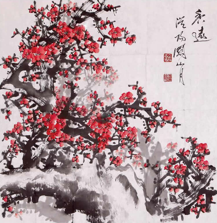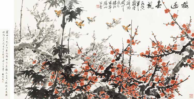 关山月梅花之所以能成为中国画梅谱系中的“独特品种”,因为在风格和情怀上,关氏梅花都与传统梅花才调大别:传统梅花固然没有关氏这样的鸿篇巨制,关氏张扬充满扩张感的美学品格,也很难在温柔含蓄的经典中找到对应;传统梅花在中国文化谱系中扮演了瘦峭、清轻、幽独、高洁的形象,而关氏梅花却表现了“铁骨傲冰雪,幽香透国魂”的精神。