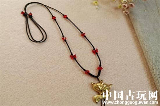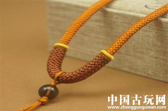 将吊坠正面朝上,两边的绳子保持一样的长度,用两根小绳子分开绑住绳子的两端,在绑扎的中间处穿几个小的珠子,以起到固定的作用。