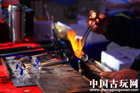 再用一根1.5米左右的吹筒将琉璃从高温火炉中取出来,取出来后应立即给琉璃造型,不断旋转,因为刚取出来的琉璃温度高,软度高,便于塑造各种形状。